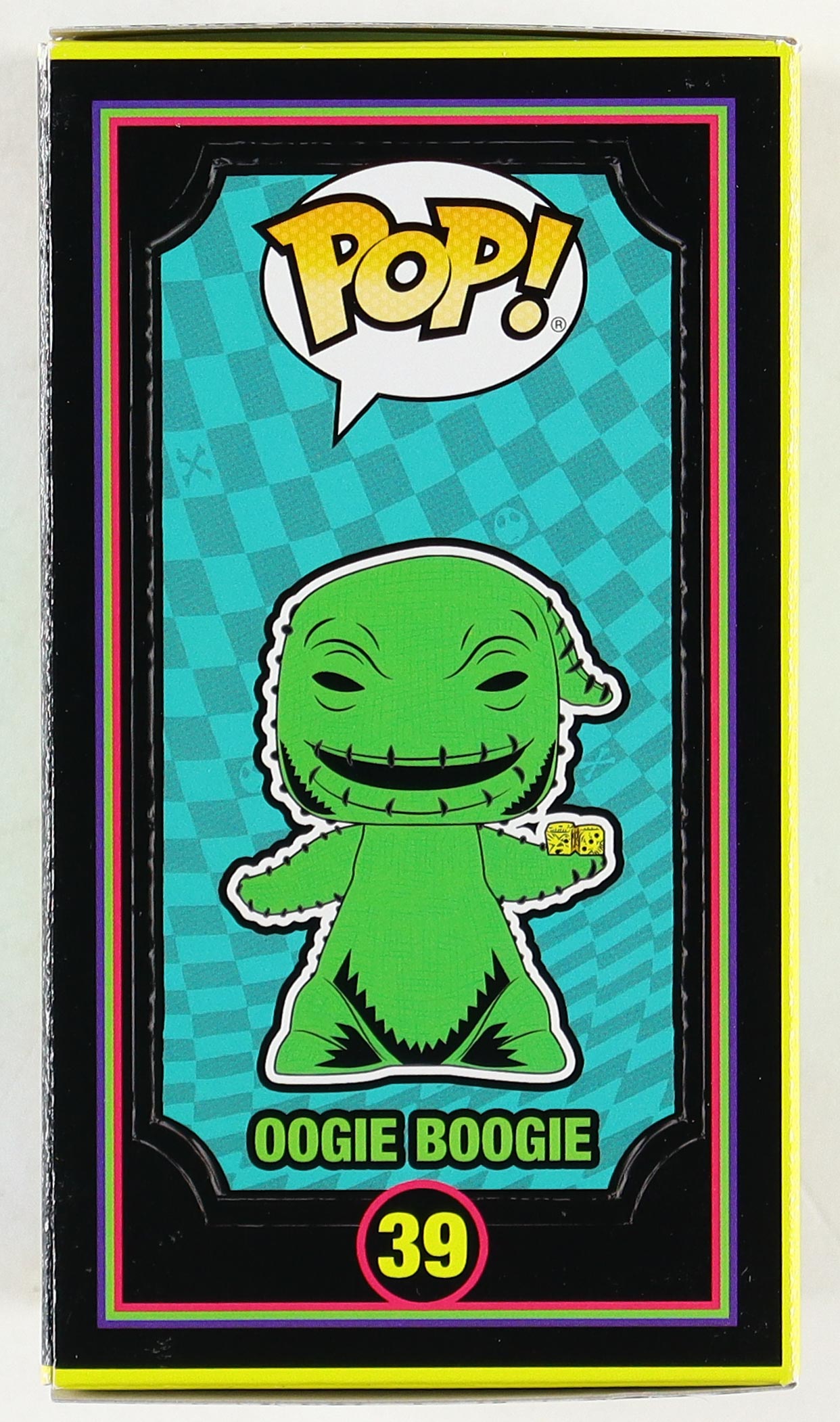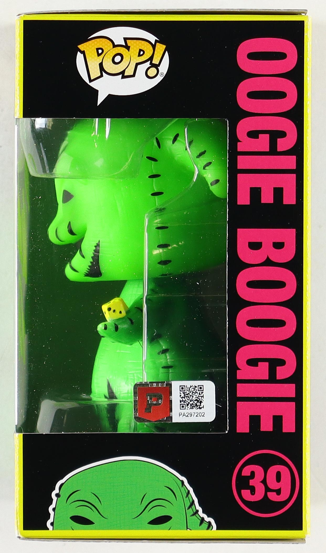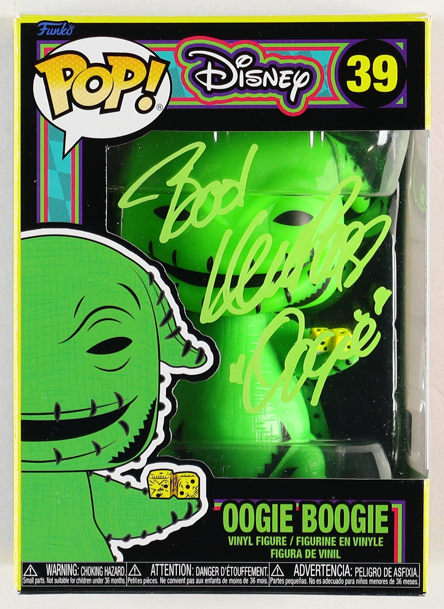 The Blacklight Disney Vinyl Funko Pop! Figure measures approximately 4" tall and comes in the original box. Hand-signed & inscribed by Ken Page (Oogie Boogie).