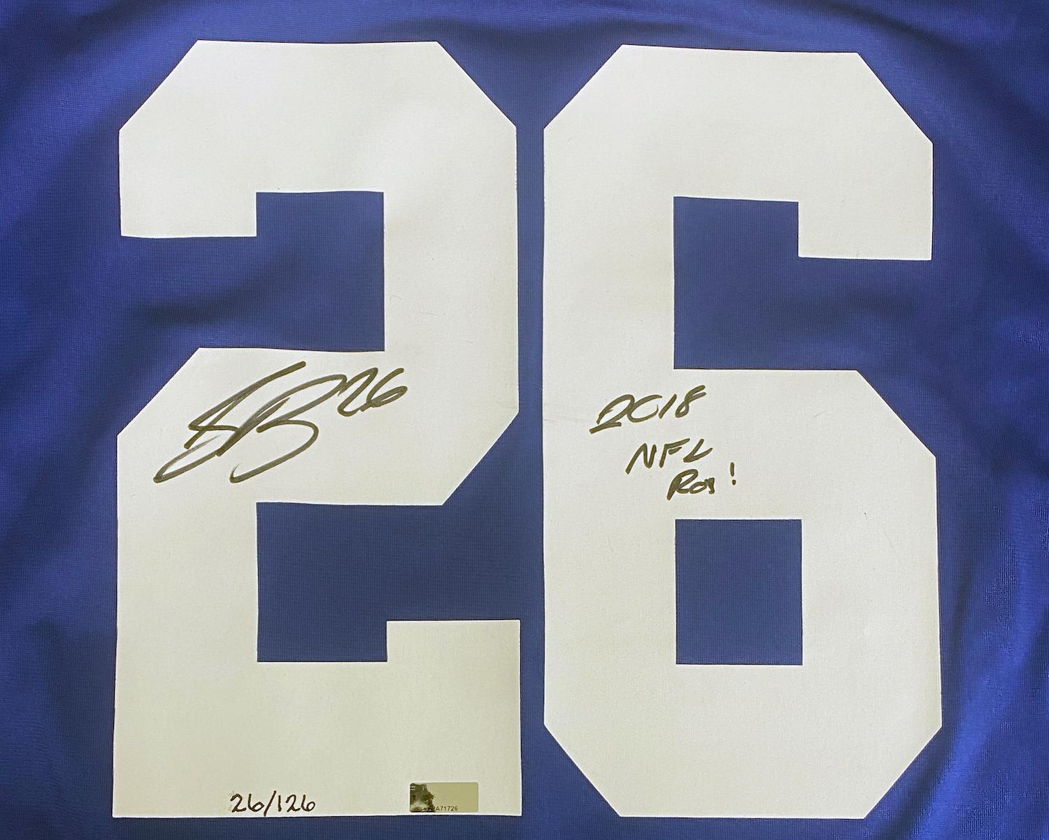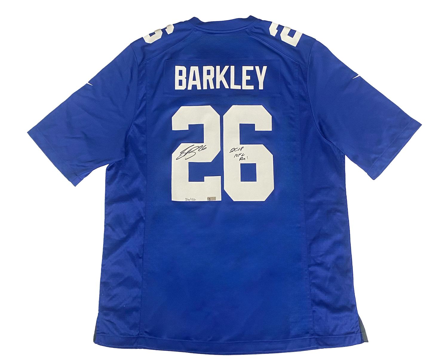 Nike football jersey. Everything pressed on, size XL. Hand-signed and inscribed by Saquon Barkley (New York Giants). The jersey is limited edition and hand-numbered #26/126.