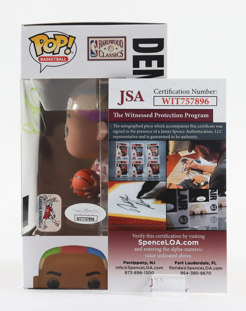 The autograph(s) includes an official James Spence Authentication (JSA) hologram and matching COA for as well as an official Fiterman Sports Dennis Rodman hologram authenticity purposes. The signing of this item was witnessed by JSA.