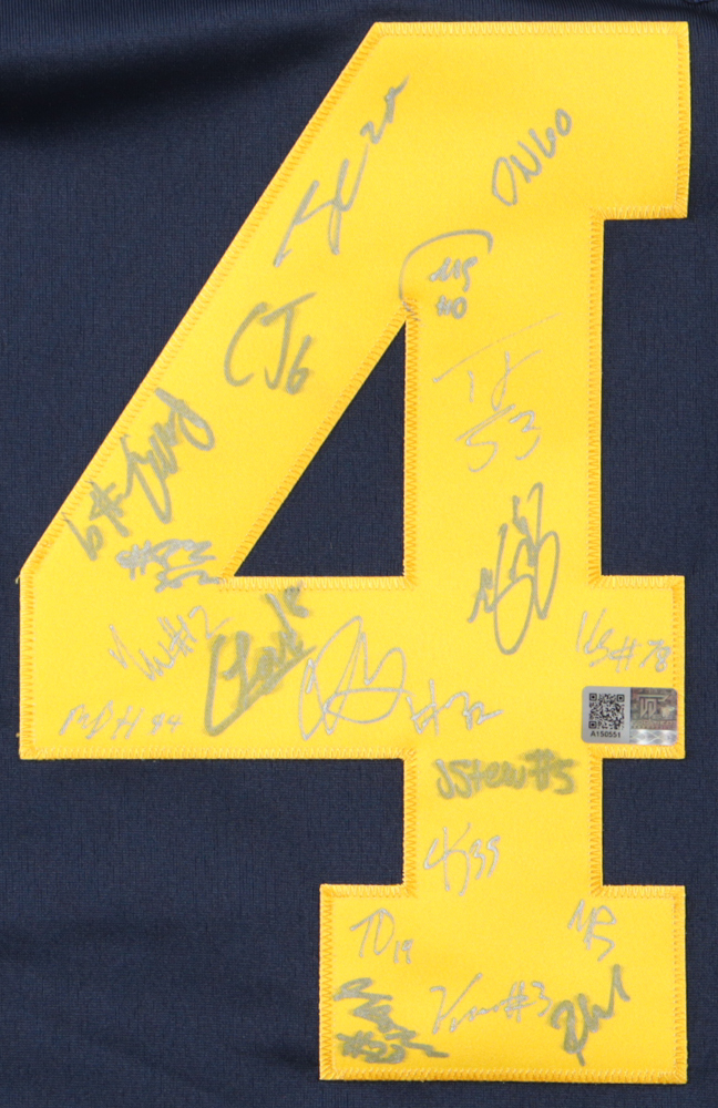 Jordan Jersey with everything sewn on, size M. Hand-signed (20) by Colston Loveland, Cornelius Johnson, Mike Sainristil, Roman Wilson, Josaiah Stewart, Kalel Mullings, Kenneth Grant, Drake Nugent, Trente Jones, Tommy Doman and 9 others (Michigan Wolverines). Will receive a limited edition #/40.