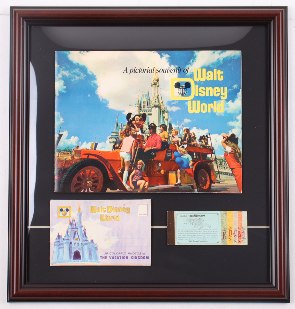 Custom frame measures approximately 17" x 18" in size and features a vintage original Disney World guide book as well as ticket book and pack of (26) Disney World postcards. Please note, the display is unsigned and there is scuffing on the frame.