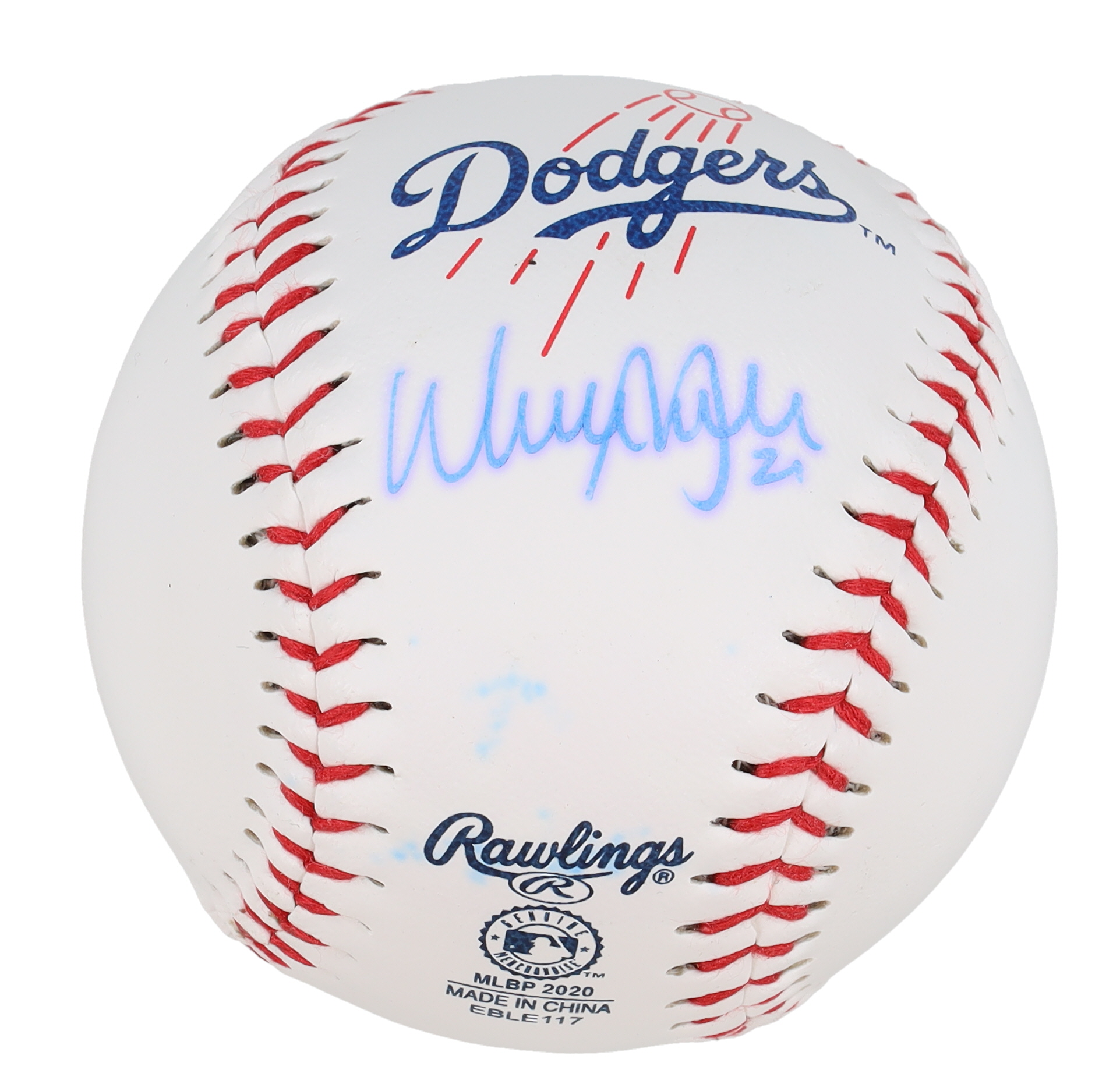 Rawlings Official Major League Dodgers Logo Baseball. Hand-signed by Walker Buehler (Los Angeles Dodgers). Please note, the signature has bled and there are stains on the baseball.
