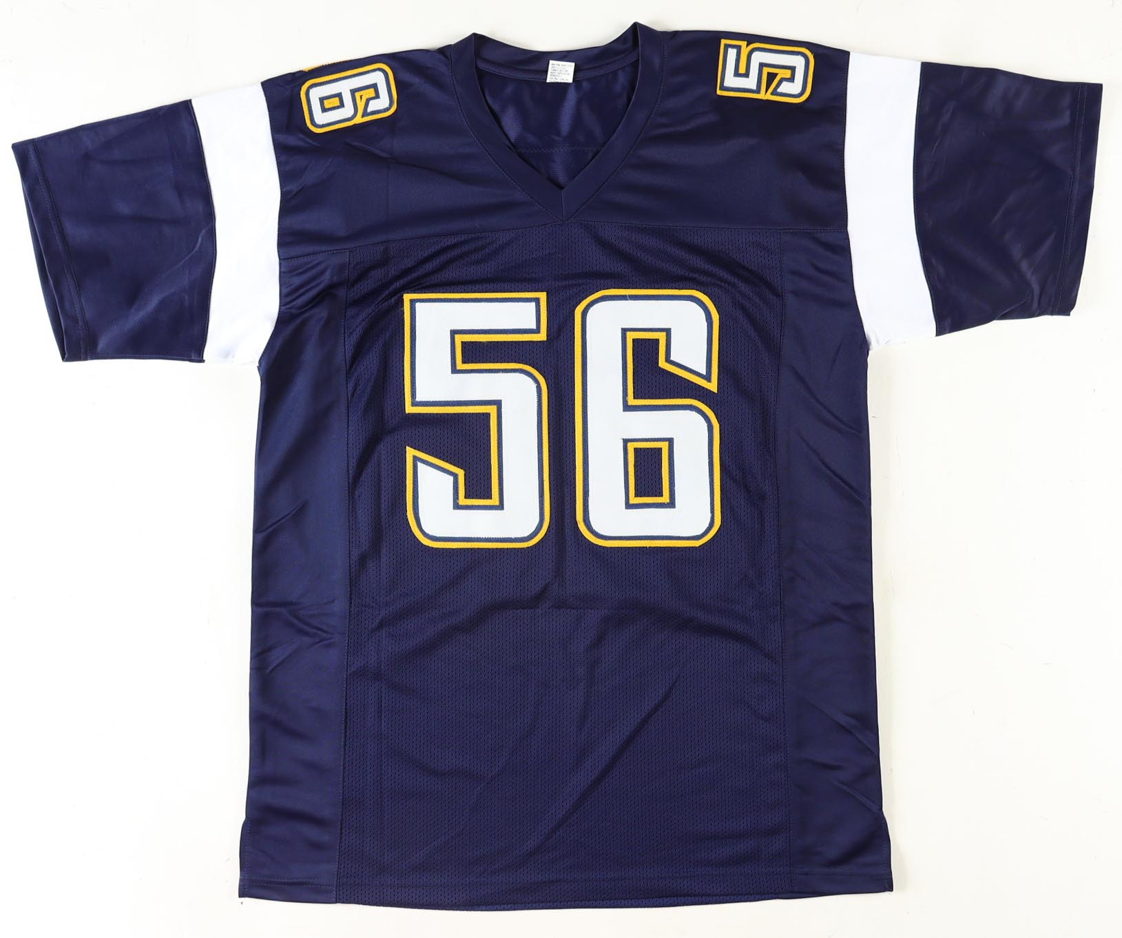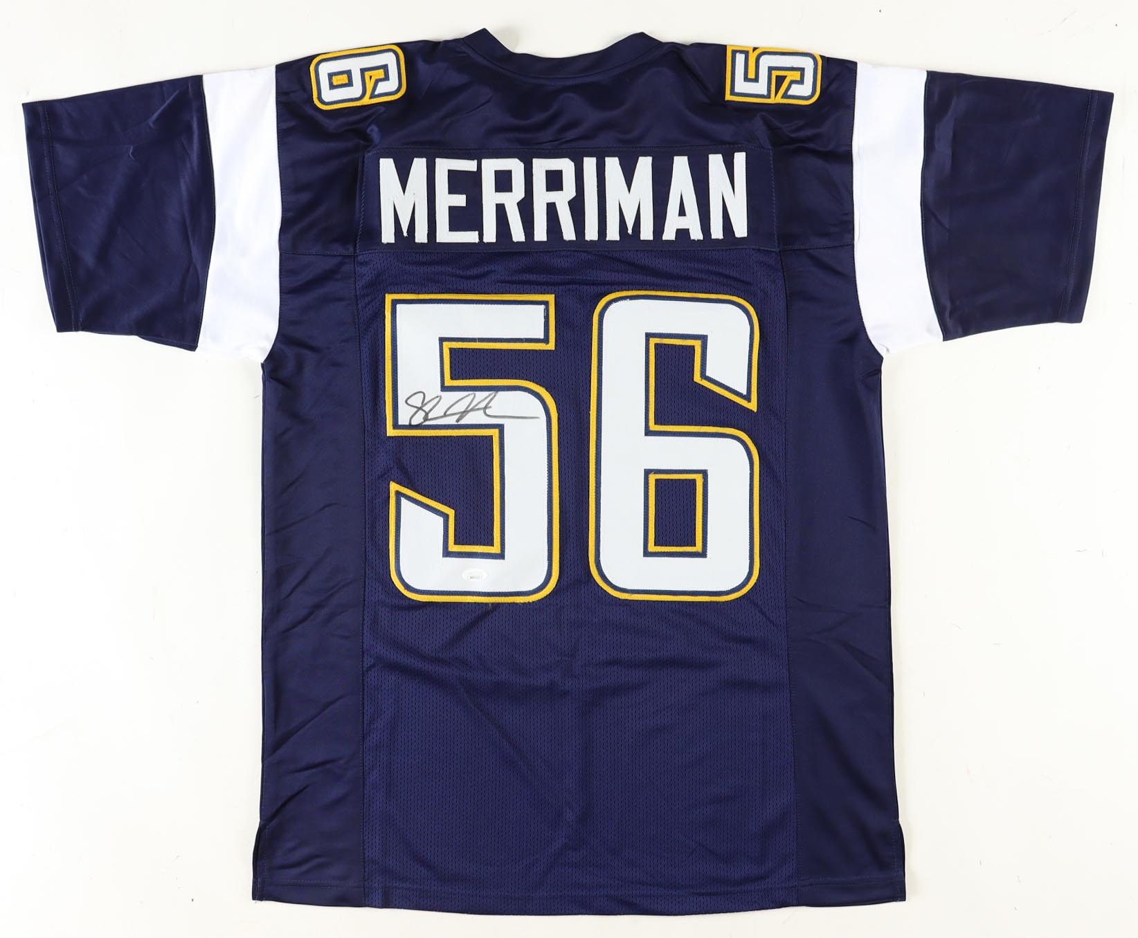 Custom jersey with everything sewn on, size XL. Hand-signed by Shawne Merriman.