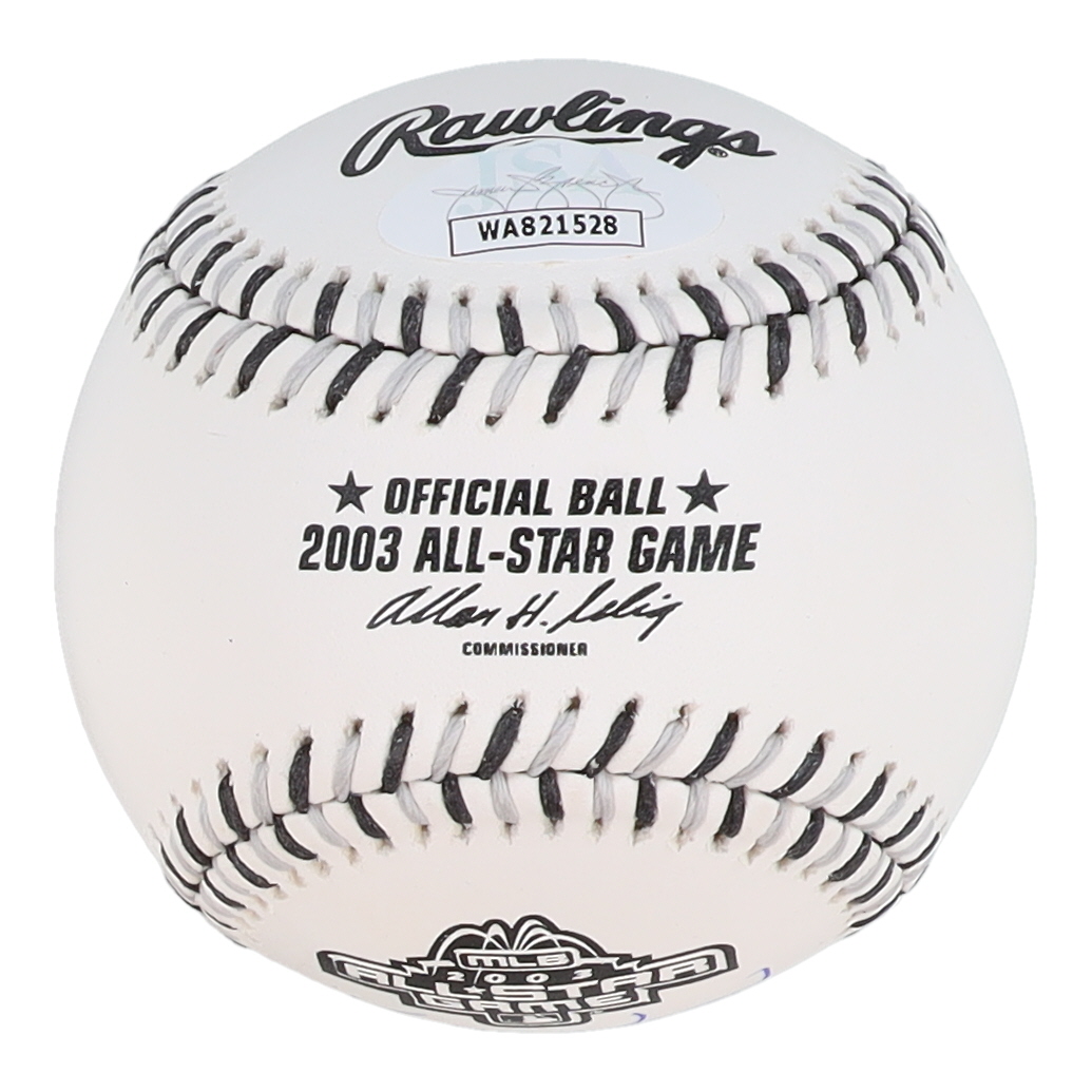Rawlings Official 2003 All-Star Game Logo Baseball. Hand-signed and inscribed by Kerry Wood (Chicago Cubs). Please note, there are minor stains on the baseball.
