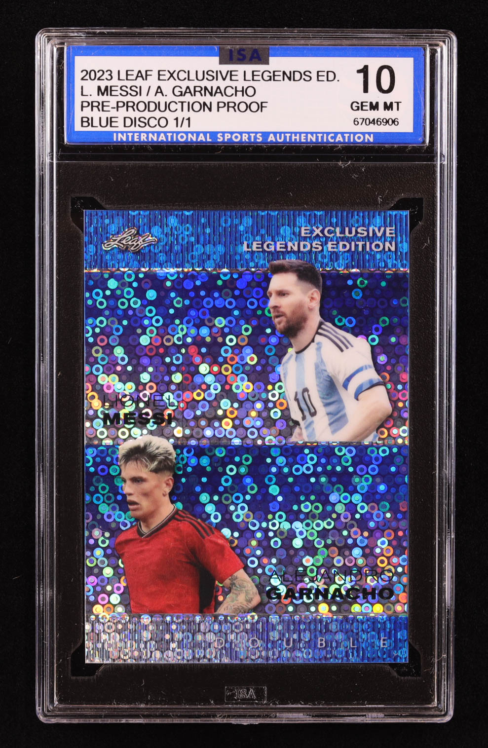 Lionel Messi / Alejandro Garnacho 2023 Leaf Exclusive Legends Edition Disco Blue Pre-Production Proof #NNO #1/1 (ISA 10)