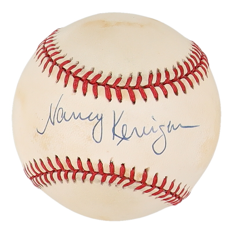 Rawlings Official American League baseball. Hand-signed by Nancy Kerrigan (HOF). Please note, the baseball is naturally toning.