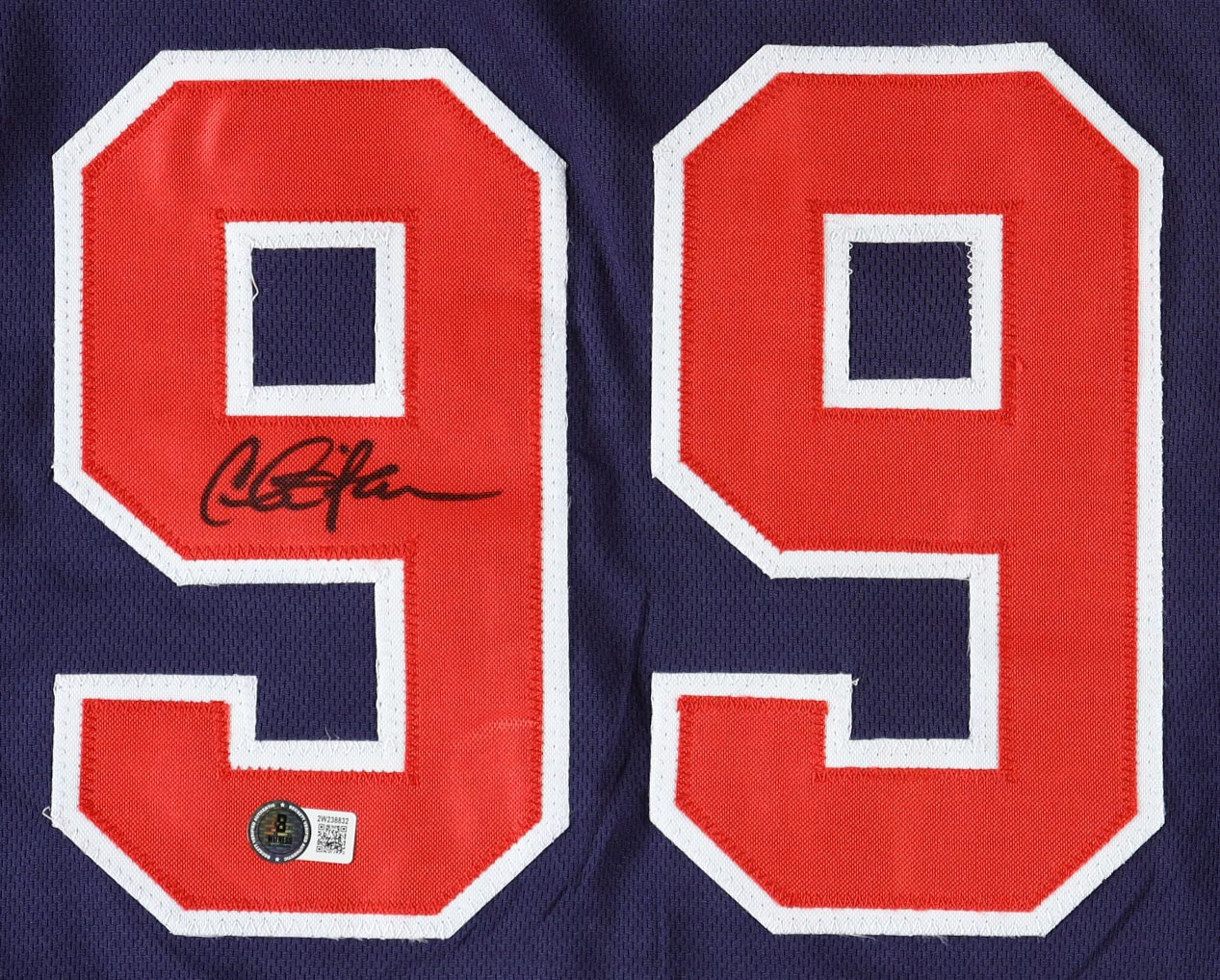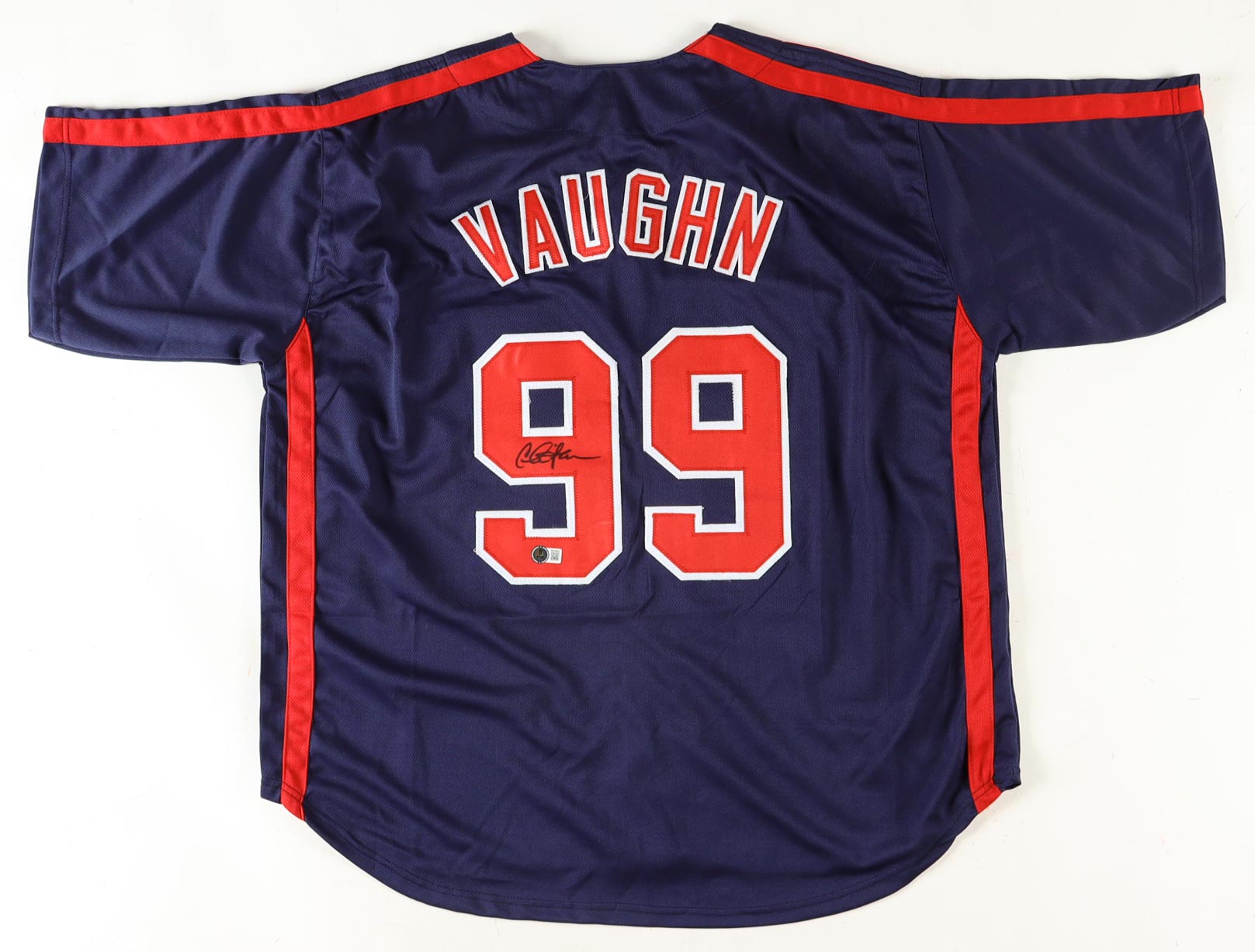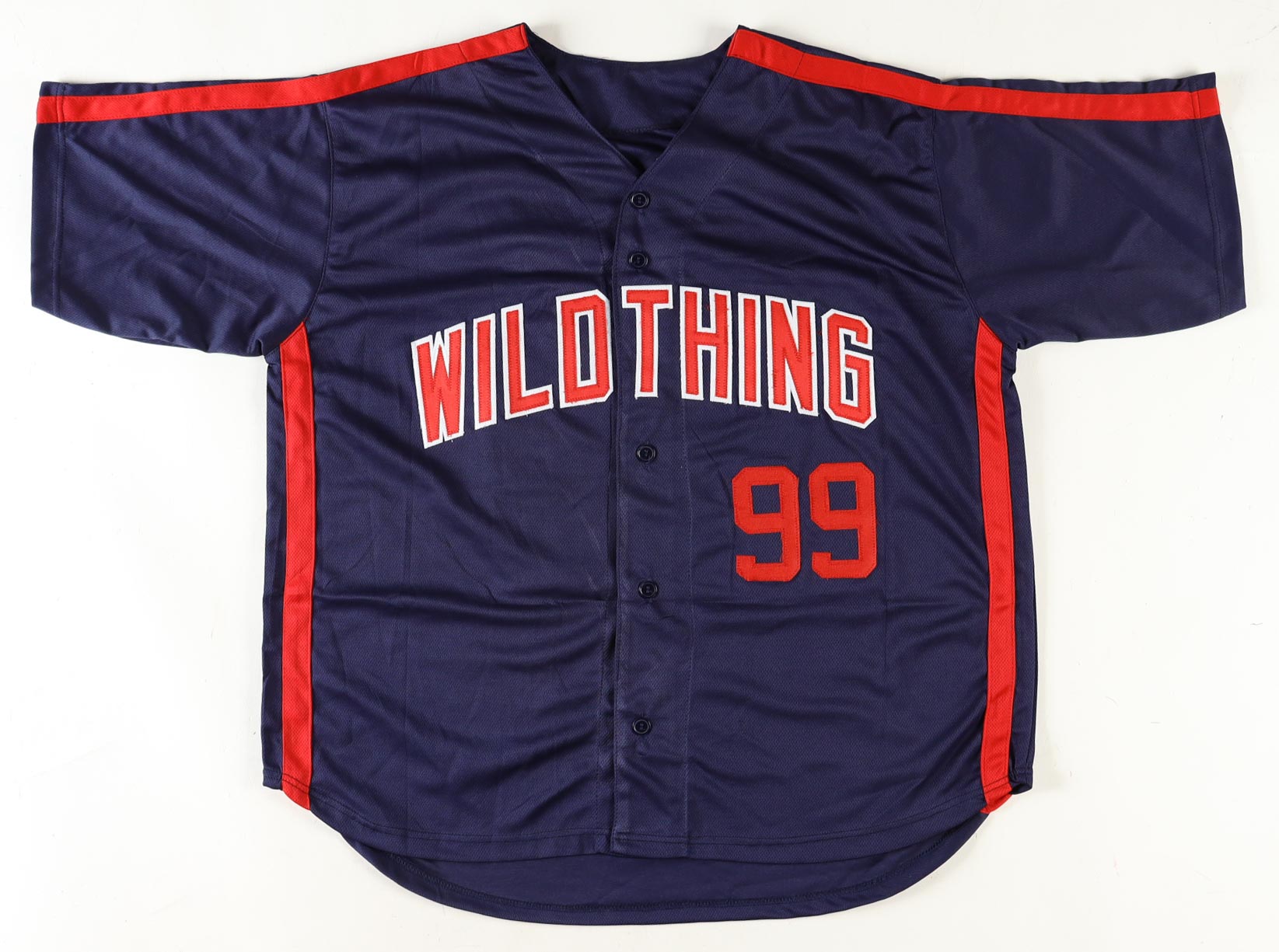 Custom jersey. Everything is sewn on, size XL. Hand-signed by Charlie Sheen (Ricky "Wild Thing" Vaughn).