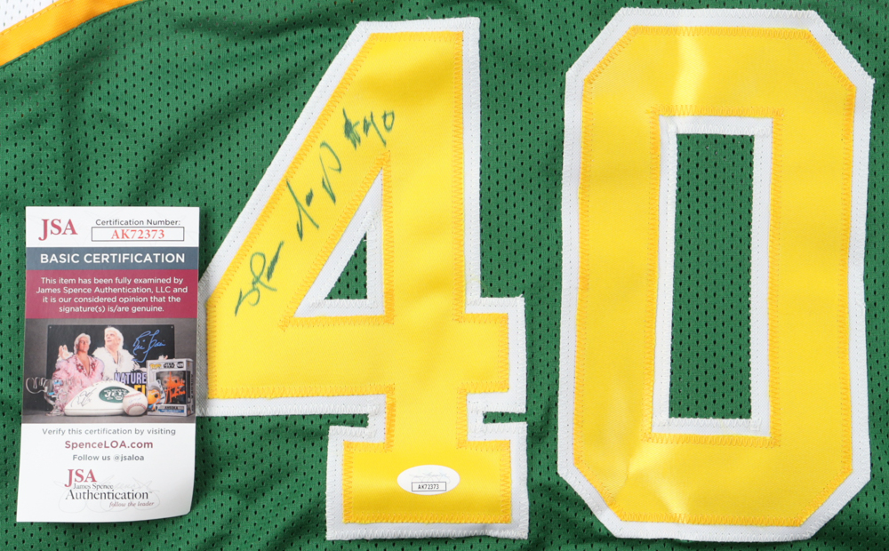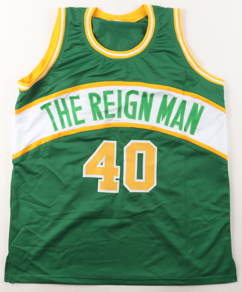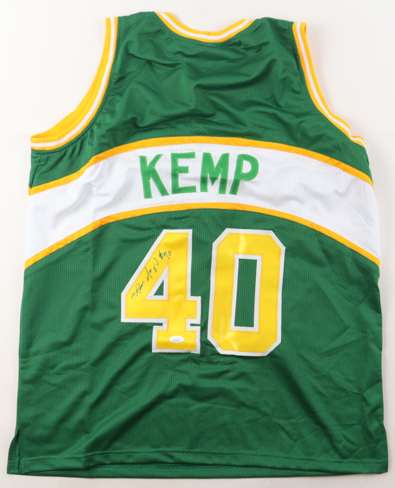 Custom jersey. Everything sewn on, size XL. Hand-signed by Shawn Kemp. Please note, the signature has bled.