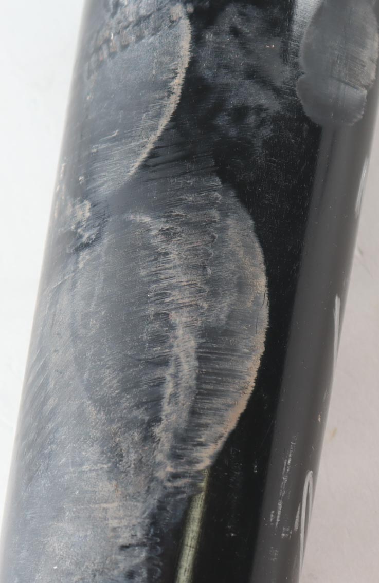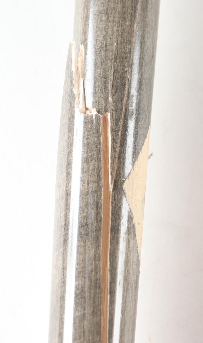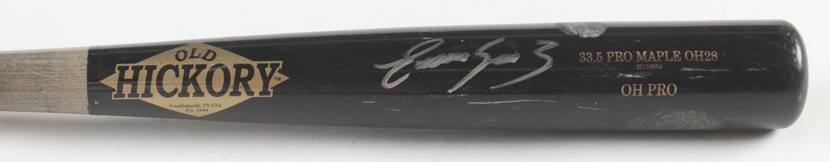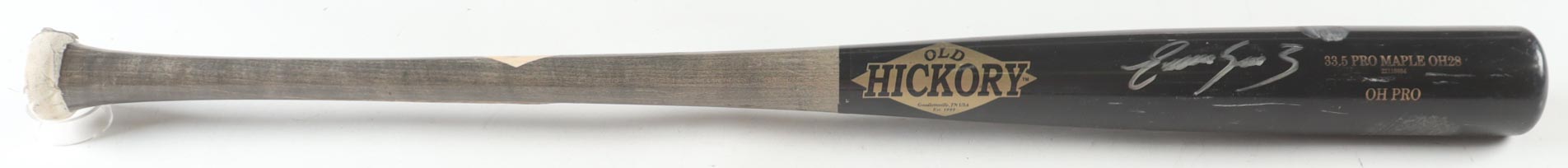 Old Hickory baseball bat. Hand-signed by Eugenio Suarez (Seattle Mariners). Please note, the bat has been game-used and cracked by an unknown player.