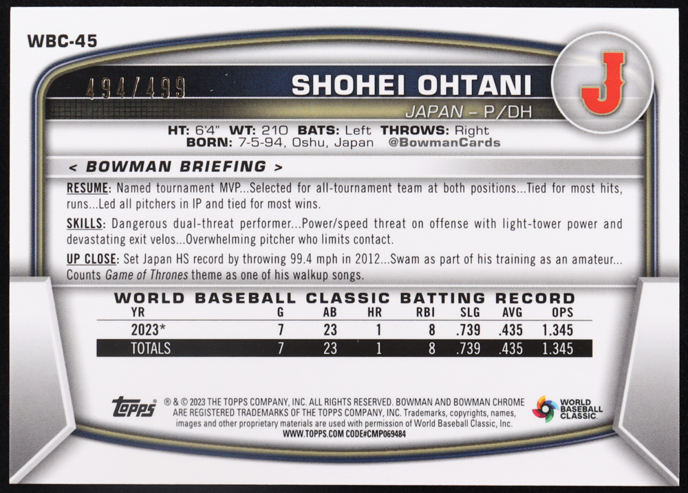 Shohei Ohtani 2023 Bowman Chrome WBC Flag Refractors #WBC45 #494/499