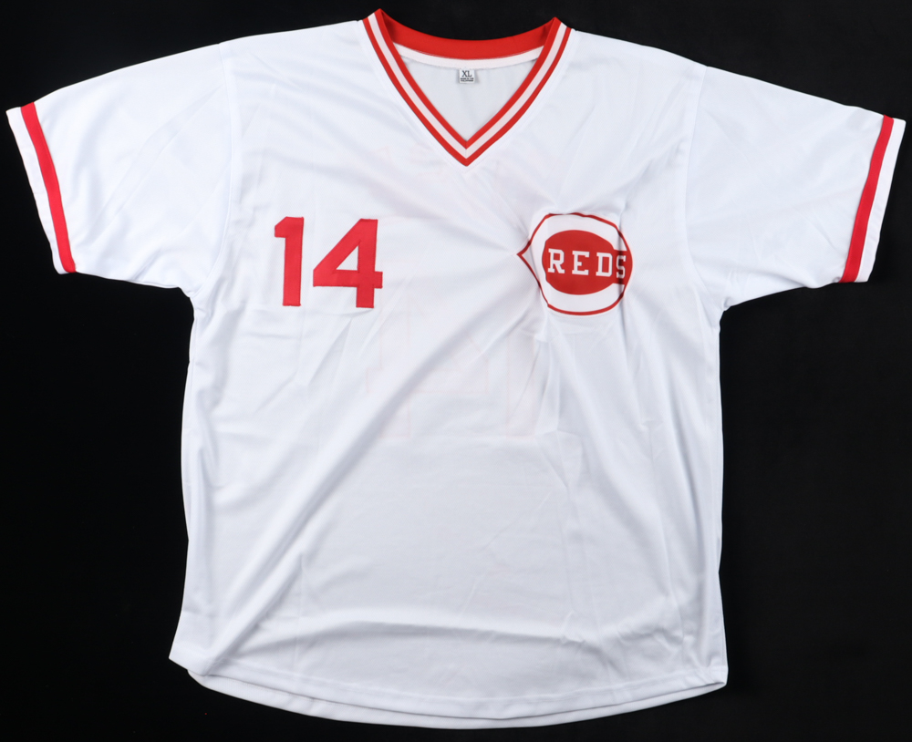 Custom jersey with everything sewn on, size XL. Hand-signed and inscribed by Pete Rose (D. 2024).
