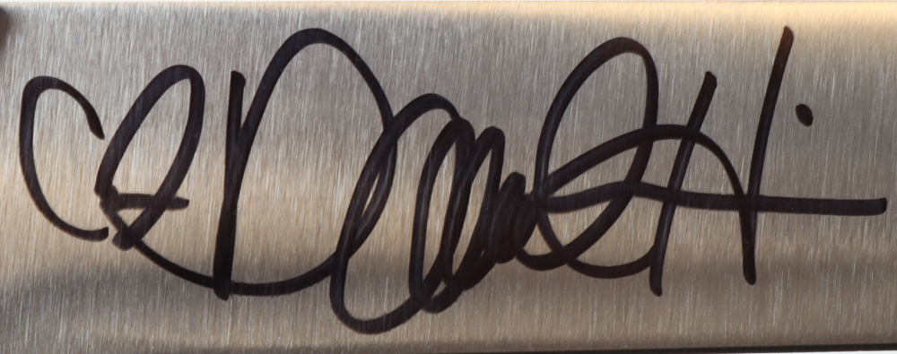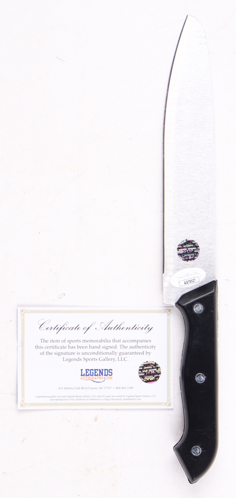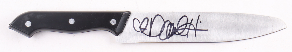 Knife measures 12" across. Hand-signed and by Danielle Harris (Jamie Lloyd). Please note, the autograph and inscriptions have scuffing and the knife is not a replica and is sharp with some damages to it.