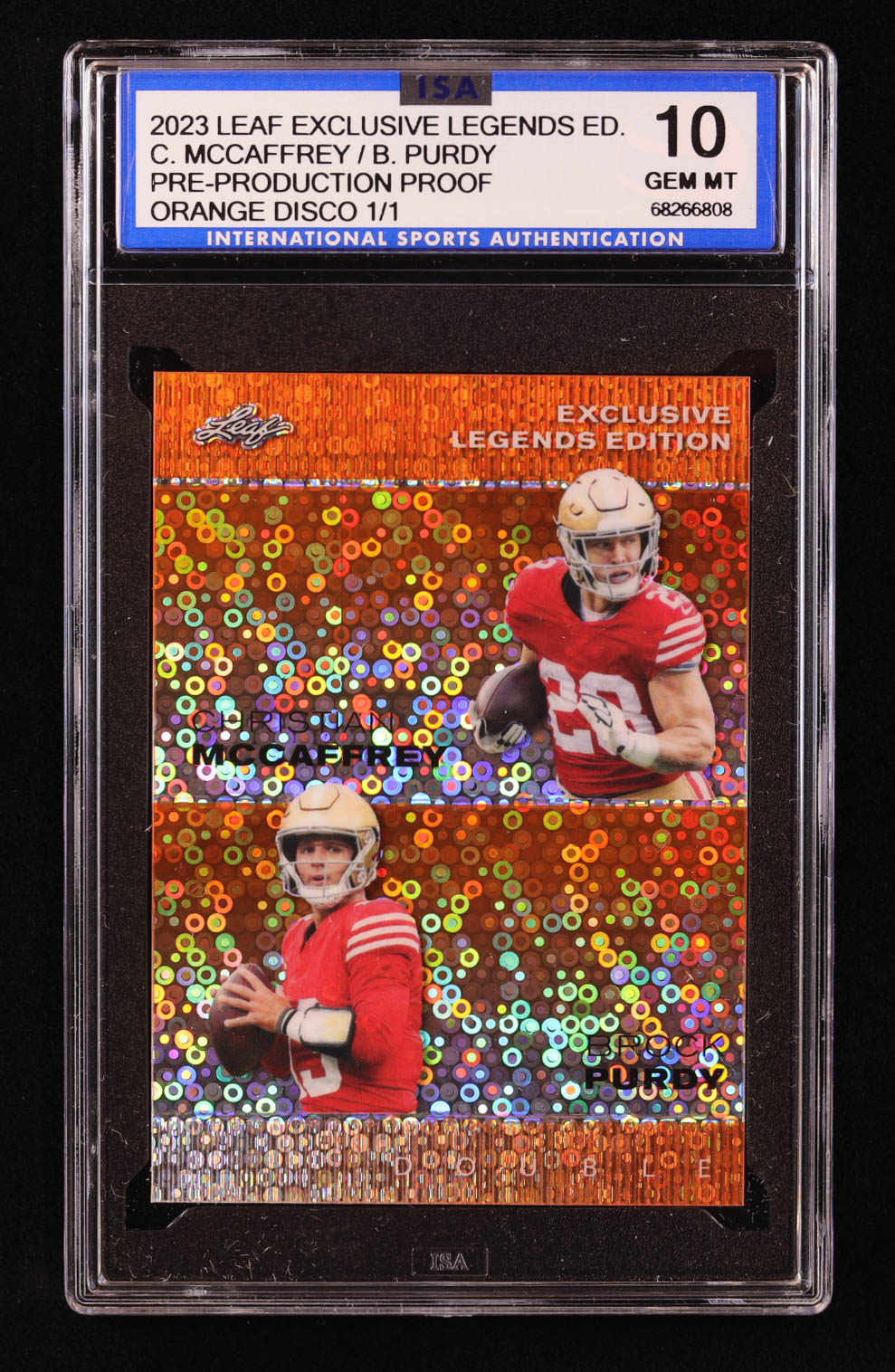 Christian McCaffrey / Brock Purdy 2023 Leaf Exclusive Legends Edition Disco Orange Pre-Production Proof #NNO #1/1 (ISA 10)