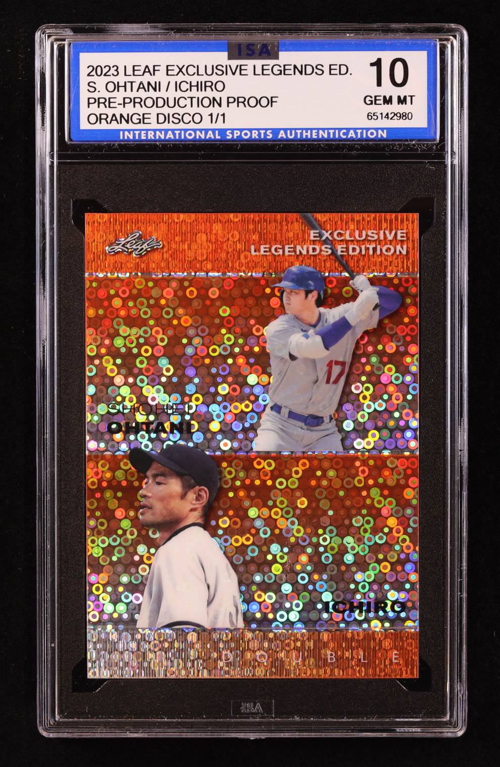 Shohei Ohtani / Ichiro Suzuki 2023 Leaf Exclusive Legends Edition Disco Orange Pre-Production Proof #NNO #1/1 (ISA 10)