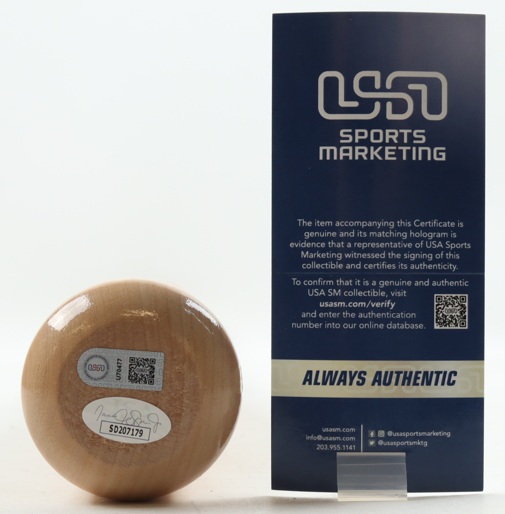 The autograph(s) includes an official James Spence Authentication (JSA) "Signature Debut" hologram and COA as well as an official USA Sports Marketing (USA SM) hologram. "Signature Debut" is the autographed memorabilia equivalent to a rookie card. The JSA definition of a "Signature Debut" is as follows: "Any item that is autographed and received by JSA prior to the last game of the signer's official rookie season.