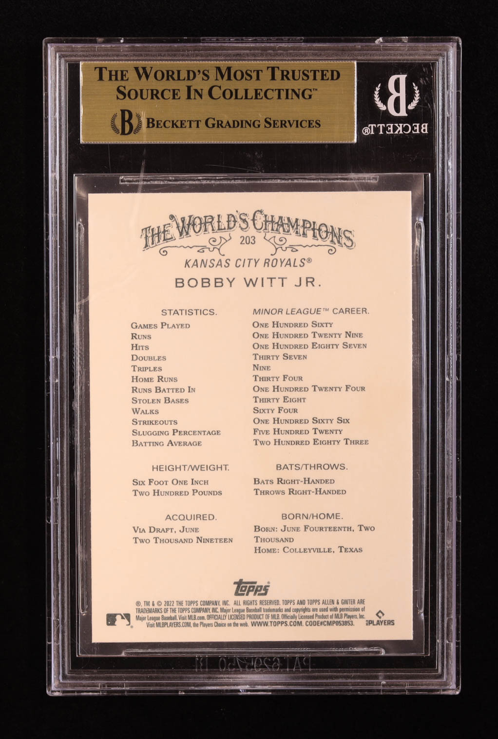 Bobby Witt Jr. 2022 Topps Allen & Ginter #203 RC (BGS 10)