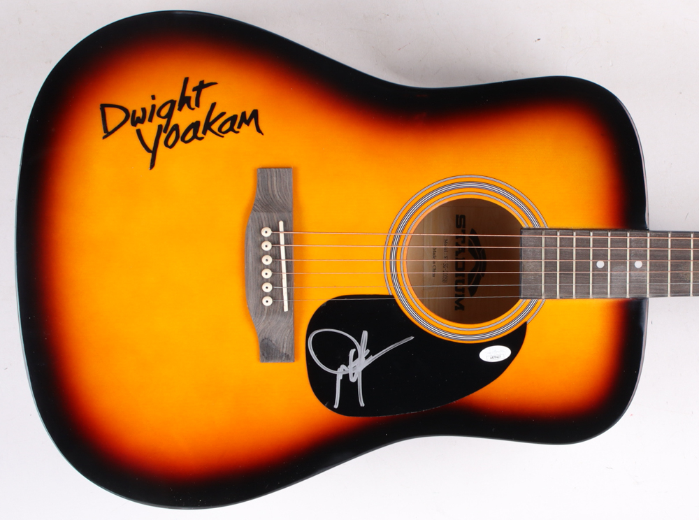Stadium Acoustic guitar measures approximately 38" in length and has been hand-signed on the pick-guard by Dwight Yoakam.