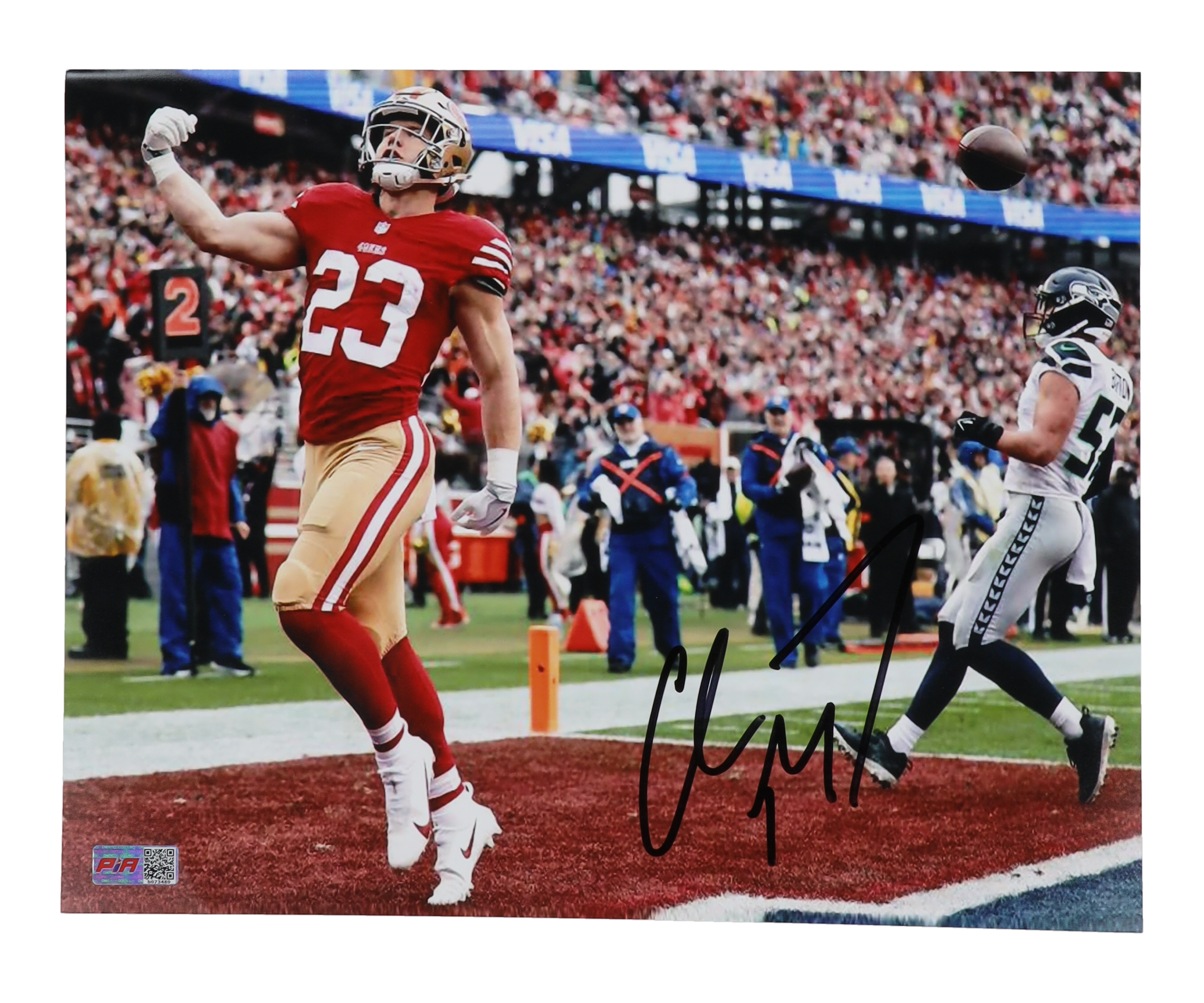 Photo measures 11" x 14" in size. Hand-signed by Christian McCaffrey (San Fransisco 49ers).