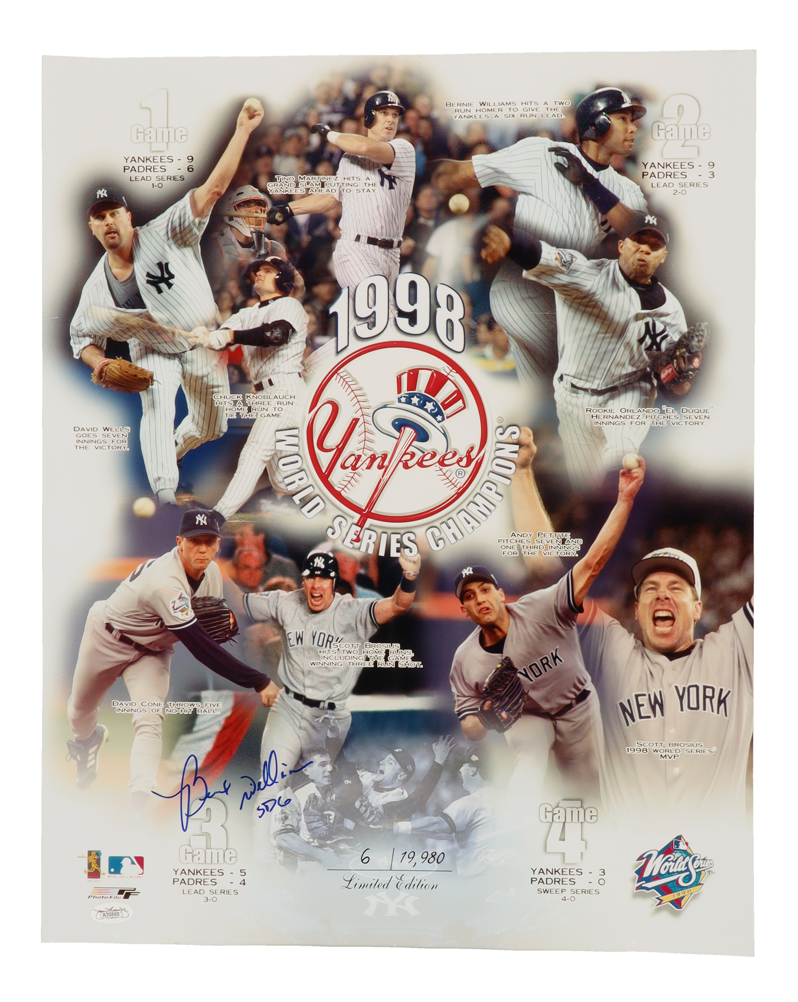 Photo measures 16" x 20" in size and has been hand-signed by Bernie Williams (New York Yankees).