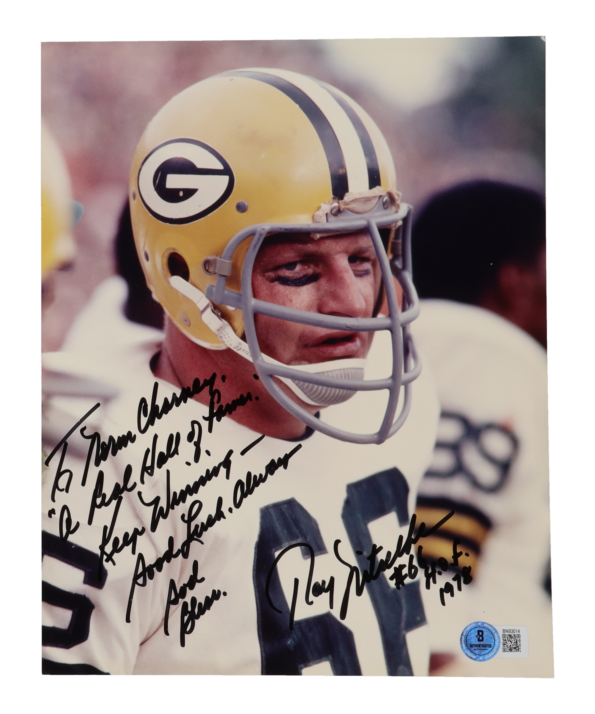 Photo measures 8" x 10" in size. Hand-signed and inscribed by Ray Nitschke (D. 1998, Green Bay Packers, HOF).
