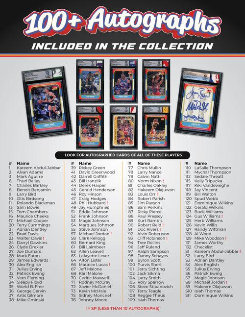 Our JF tradition of including a QR code on the back of these holders brings collectors to a webpage hosting all of the authentication information and the original memorabilia piece images. Every card and sticker in the original Fleer series is included with at least 50 complete sets, checklists with multiple premium autographs, and 125 Michael Jordan RCs!