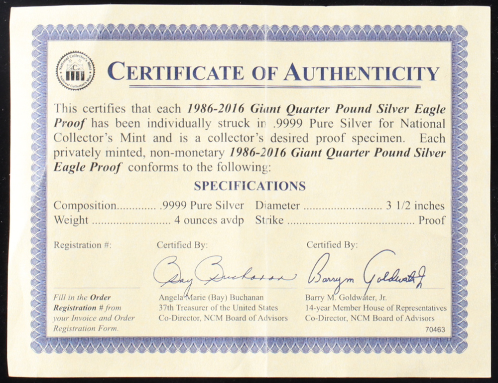 2016 National Collector's Mint Giant Quarter Pound Silver Eagle Proof .999 Pure Silver Coin