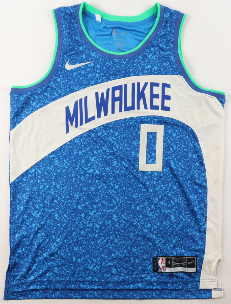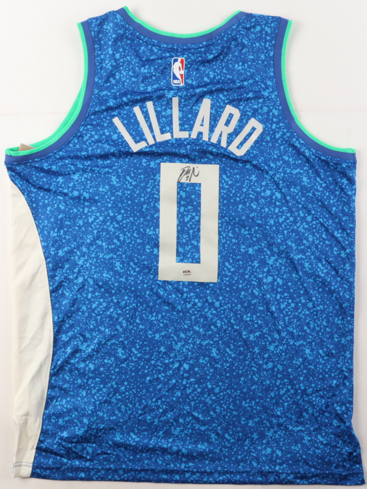Nike jersey with everything pressed on, size L. Hand-signed by Damian Lillard.