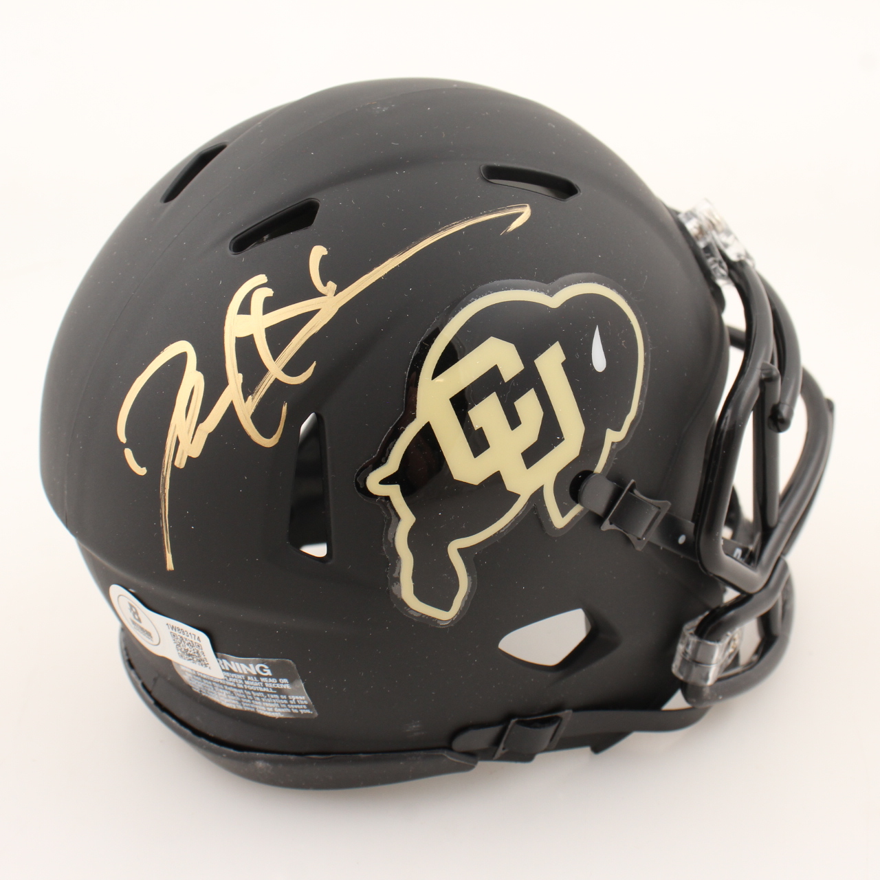 Riddell Colorado Buffaloes Speed Mini Helmet has been hand-signed by Deion Sanders.