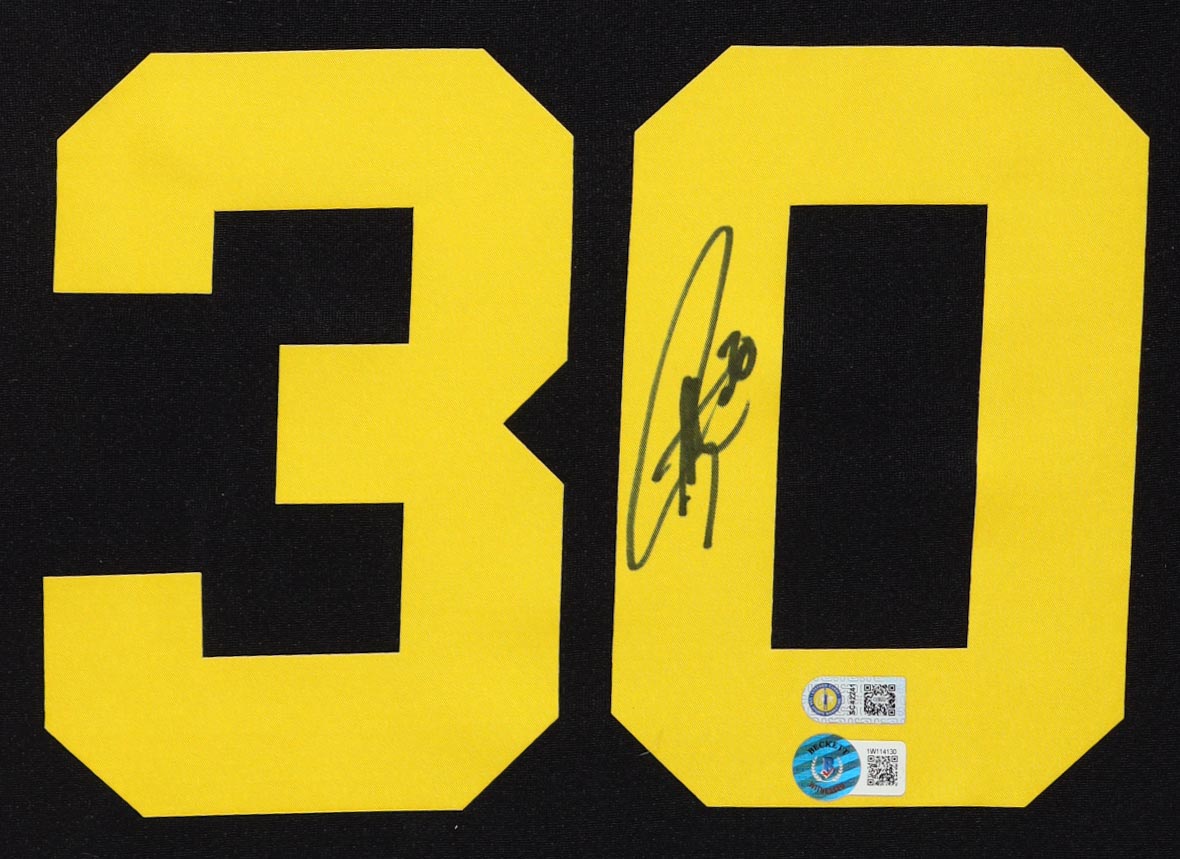 These rare, mint-condition cards are beautifully framed along with the jersey, making this piece a true collector's dream. The bold signature on the jersey, prominently placed across the number "30," adds significant value to this already remarkable display.