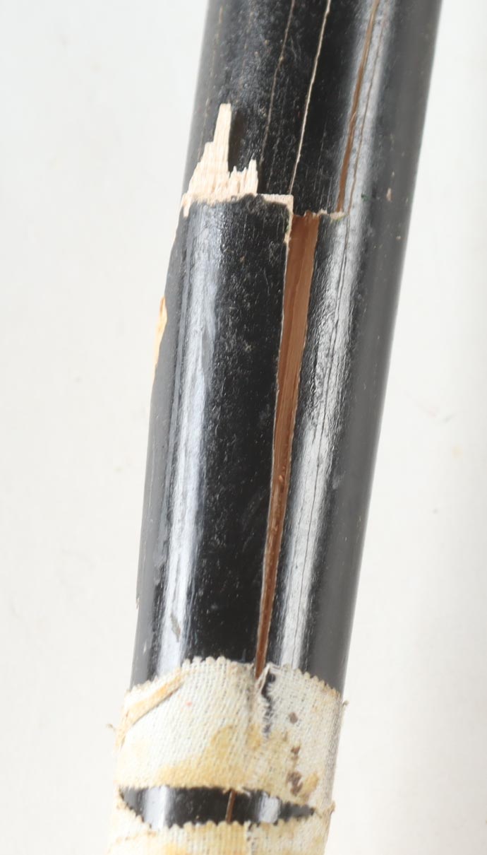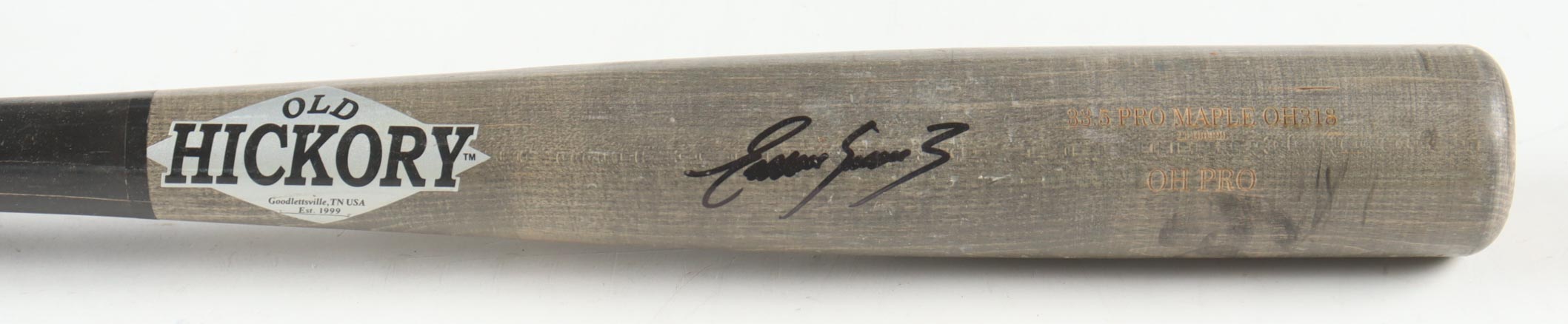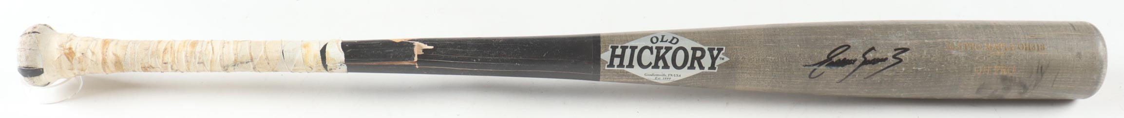 Old Hickory baseball bat. Hand-signed by Eugenio Suarez (Seattle Mariners). Please note, the bat has been game-used and cracked by an unknown player.
