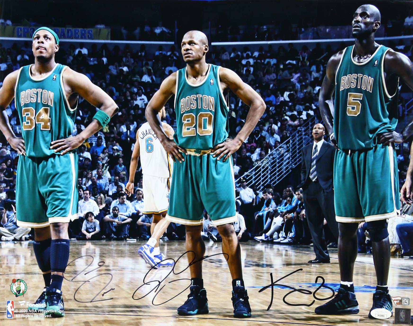 Photo measures 16" x 20" in size and has been hand-signed by Kevin Garnett (HOF), Ray Allen (HOF) and Paul Pierce (HOF).