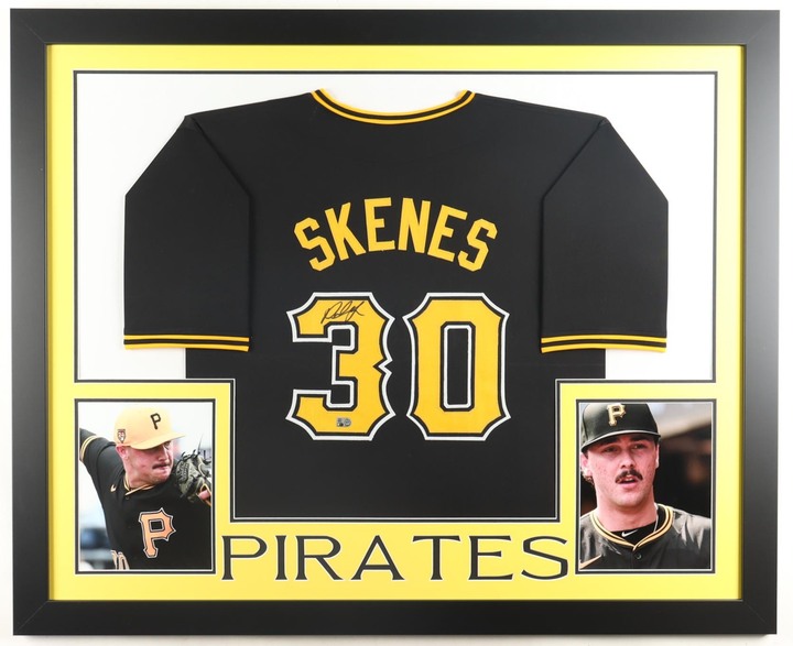 Custom frame measures approximately 35" x 43" in size and features a jersey that has been hand-signed by Paul Skenes.