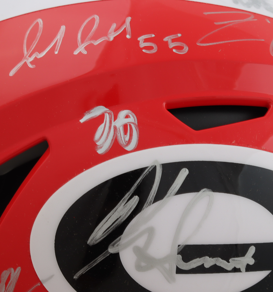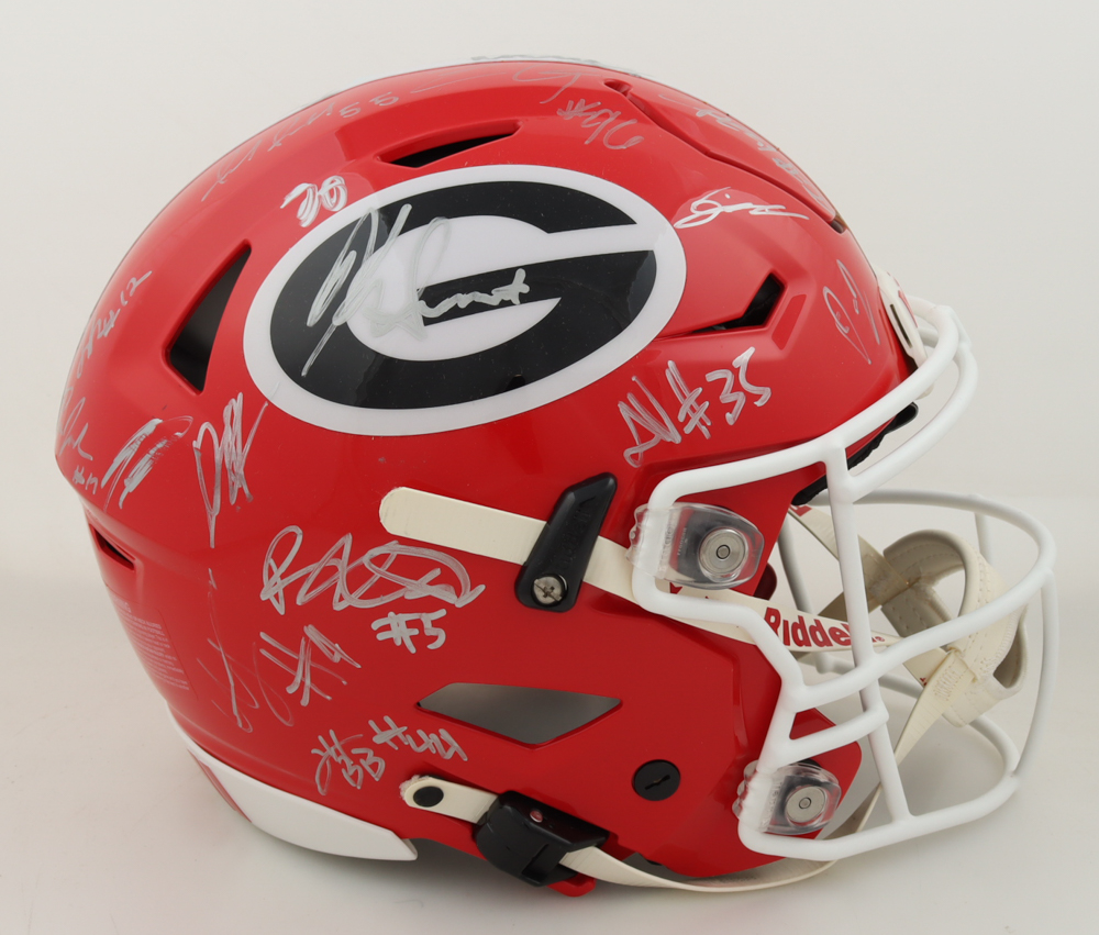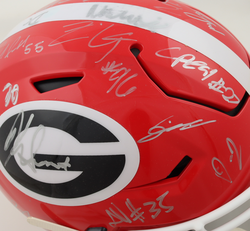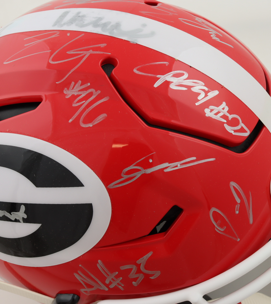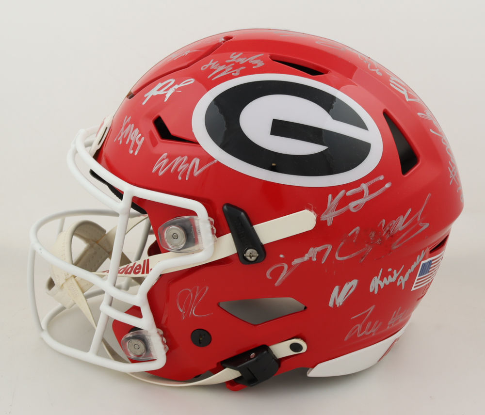 Riddell Georgia Bulldogs full-size authentic on-field SpeedFlex helmet has been hand-signed by (34) with Brock Vandagriff, Dominic Lovett, KJ Bolden, Sam Bush, Jamaal Jarrett, Julian Humphrey, Dan Jackson, Tyler Williams, Xzavier McLeod, Nazir Stackhouse, Dylan Fairchild, Jackson Meeks, Micah Morris, William Mote, Jared Wilson, Arian Smith and (18) others.. Please note, there is scuffing on some of the signatures.