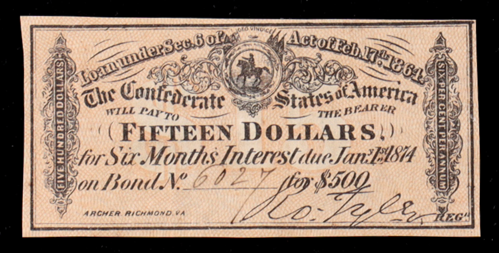 1864 $15 Fifteen Dollars Confederate States of America Richmond CSA Bank Note Bond