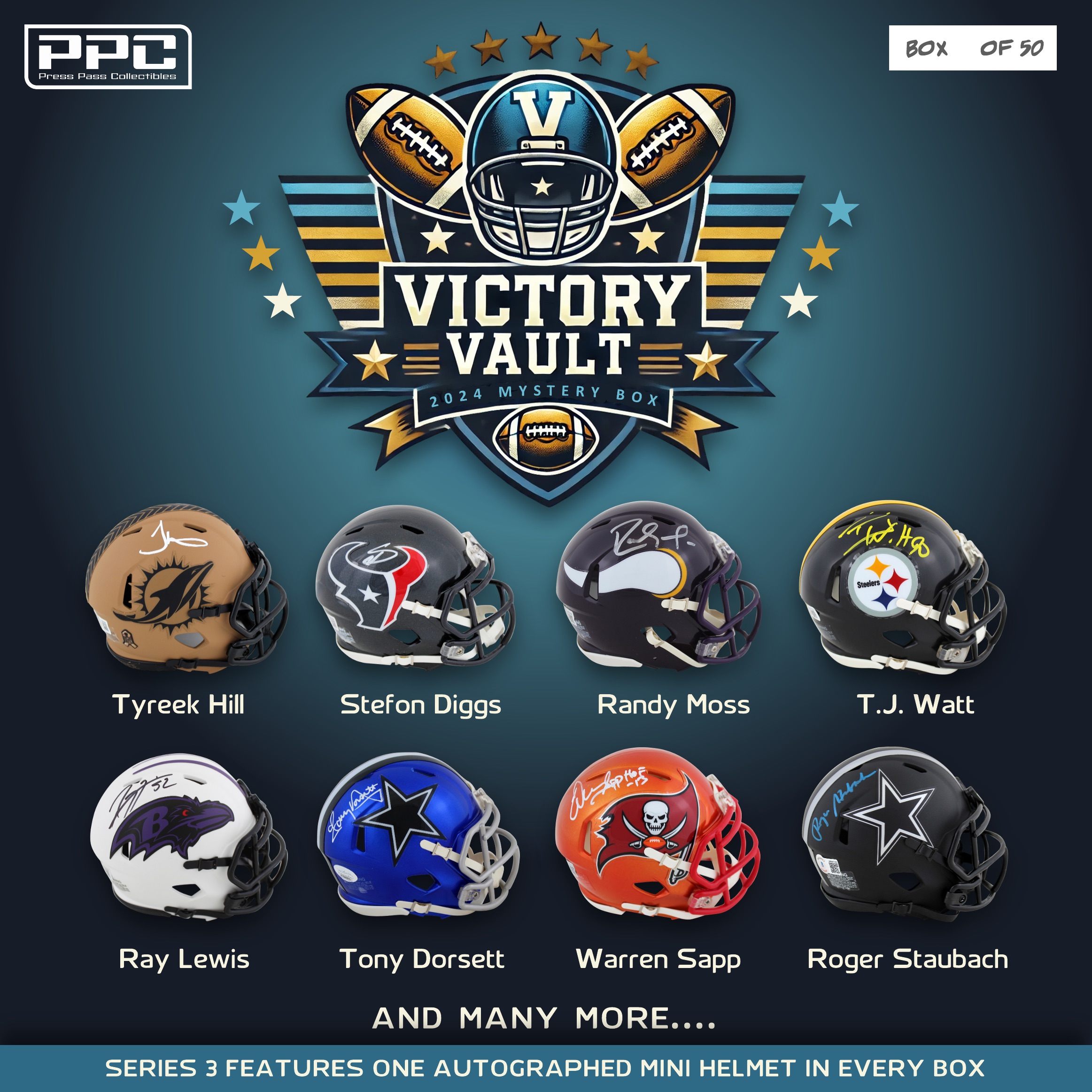 The Press Pass Collectibles 2024 victory vault mini helmet mystery box includes one (1) mini helmet from your favorite NFL teams. Some boxes will feature mini helmets Ray Lewis, Tony Dorsett, Warren Sapp, Roger Staubach, and many more!