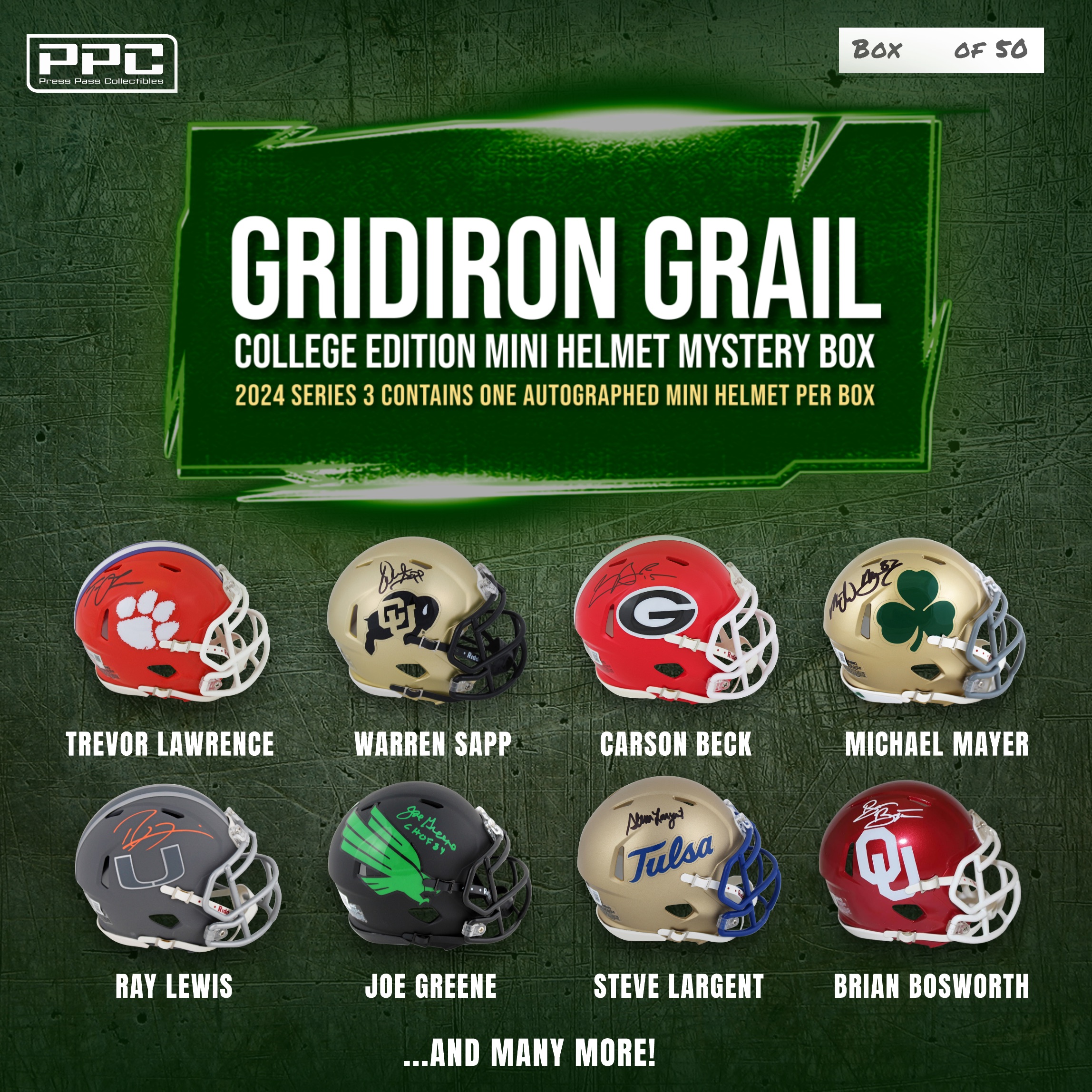 The Press Pass Collectibles 2024 gridiron grail NCAA mini helmet mystery box includes one (1) mini helmet from your favorite NCAA teams. Some boxes will feature mini helmets Ray Lewis, Joe Greene, Steve Largent, Brian Bosworth, and many more!