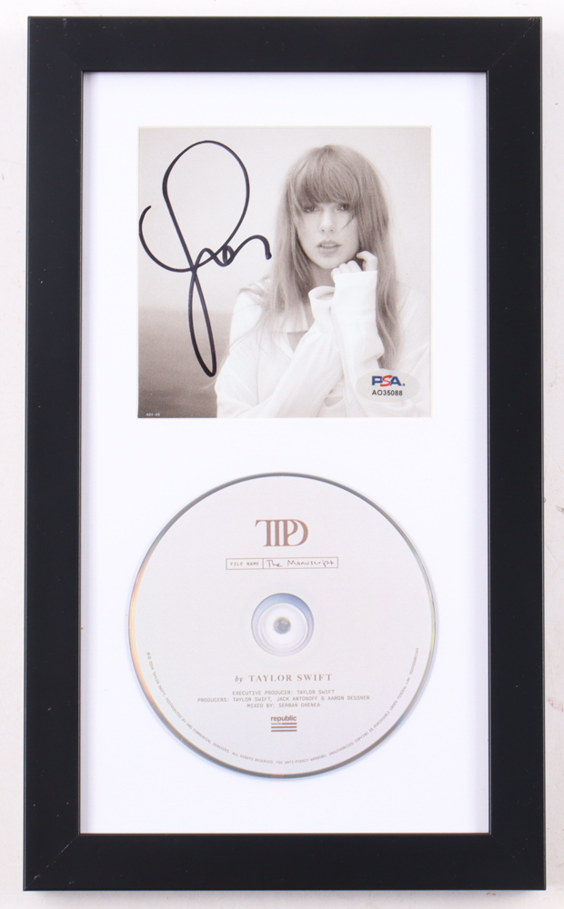 Custom frame measures approximately 8" x 13.25" in size. Features a "The Torture Poets Department" CD insert that has been hand-signed by Taylor Swift. The display also includes the disc as shown.