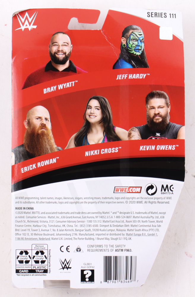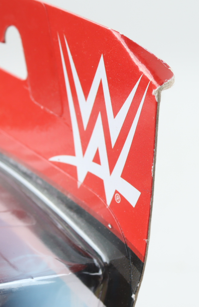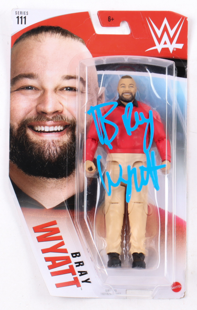 Mattel WWE Series 111 action figure. Hand-signed on the box by Bray Wyatt (D. 2023). Please note there is damage to the packaging.