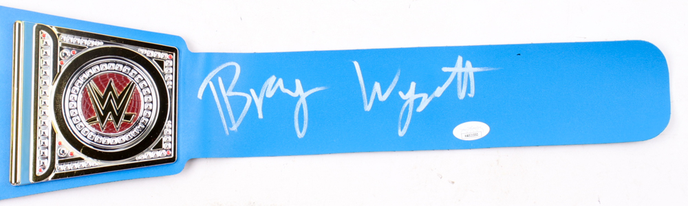 Replica toy Championship WWE belt measures approximately 37" in length. Hand-signed by Bray Wyatt (D. 2023). See photos for more details on item.