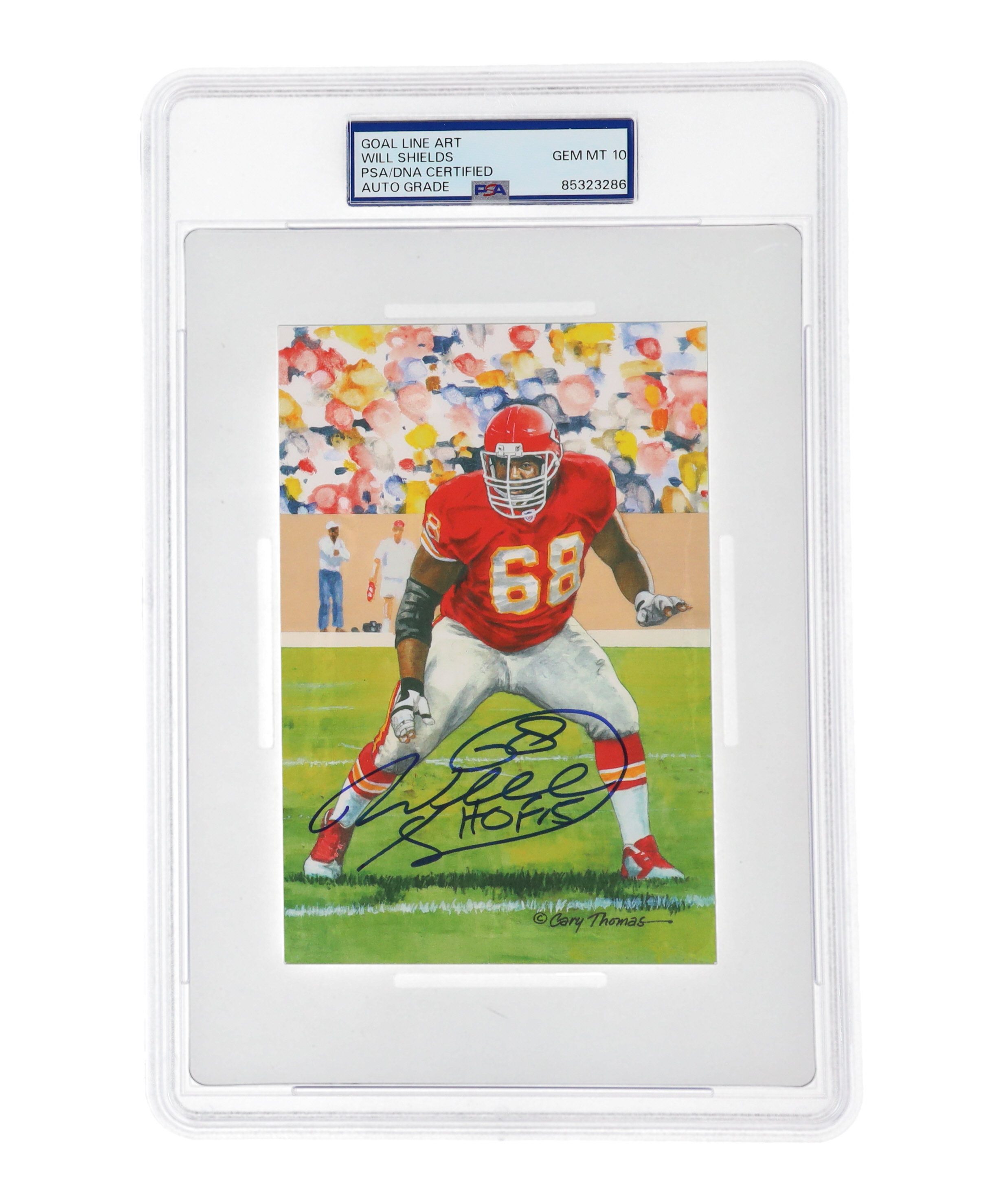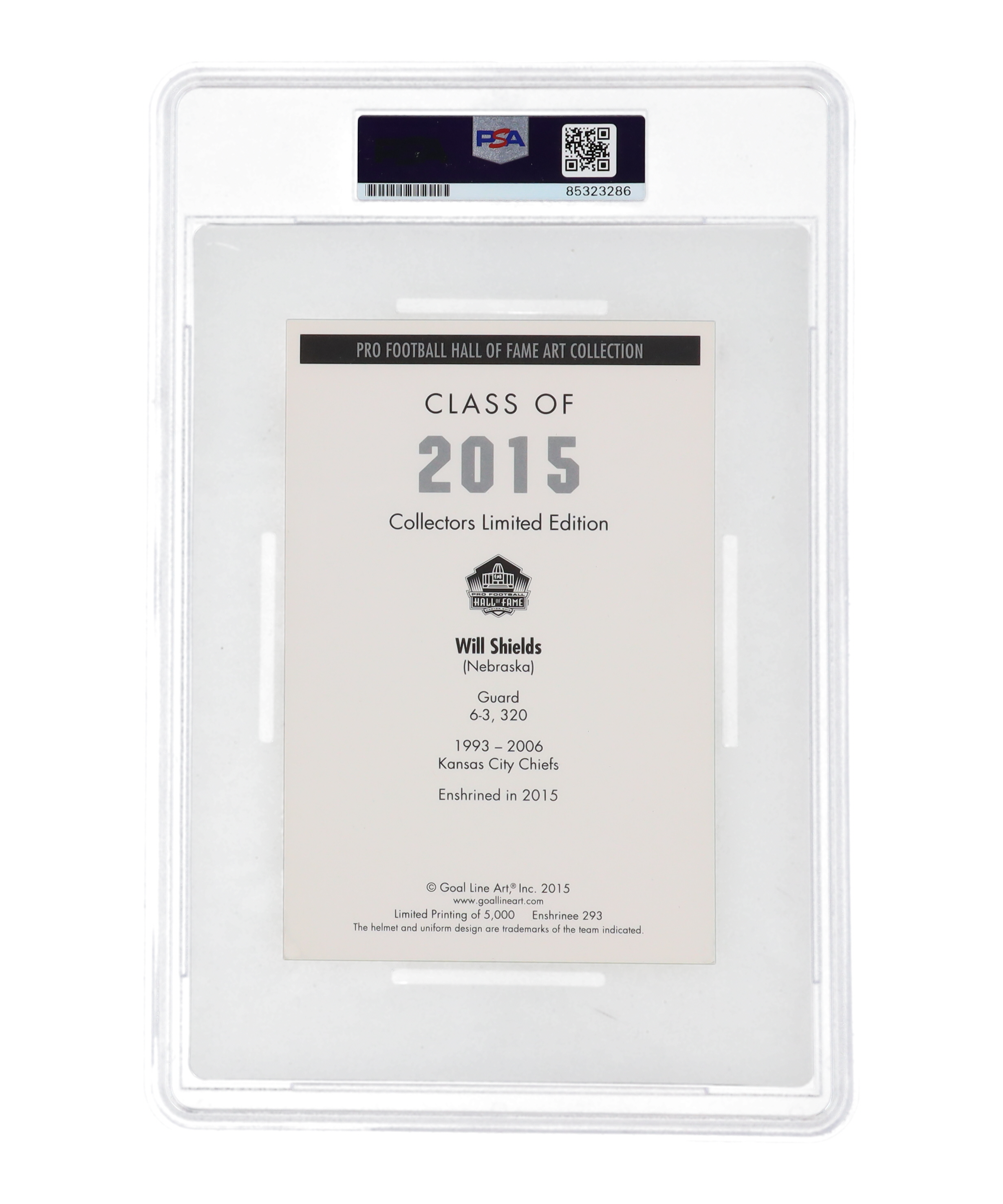 Will Shields Signed Chiefs LE Goal Line Art Hall of Fame Postcard Inscribed "HOF 15" (PSA | Auto Grade 10)