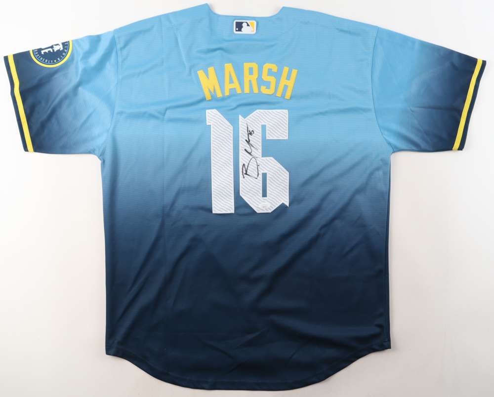 Nike jersey. Everything sewn on, size XL. Hand-signed by Brandon Marsh.