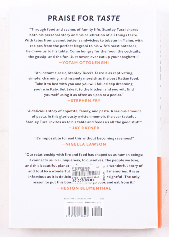 "Taste" hardcover book has been hand-signed by Stanley Tucci. Please note, there is edge wear on the book cover.