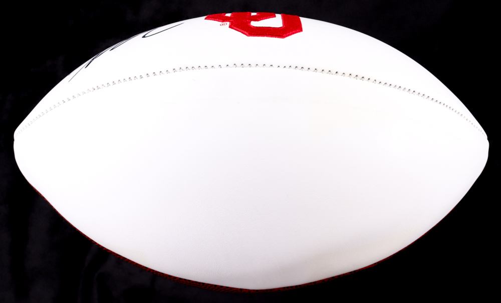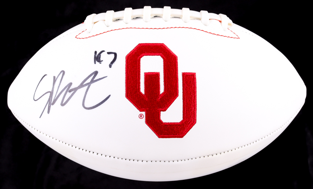 Oklahoma Sooners logo football has been hand-signed by Spencer Rattler.