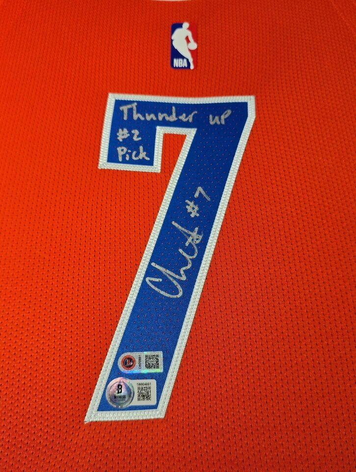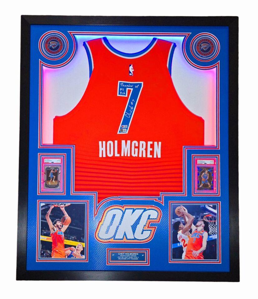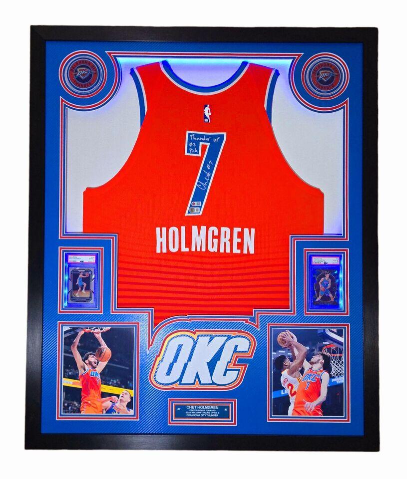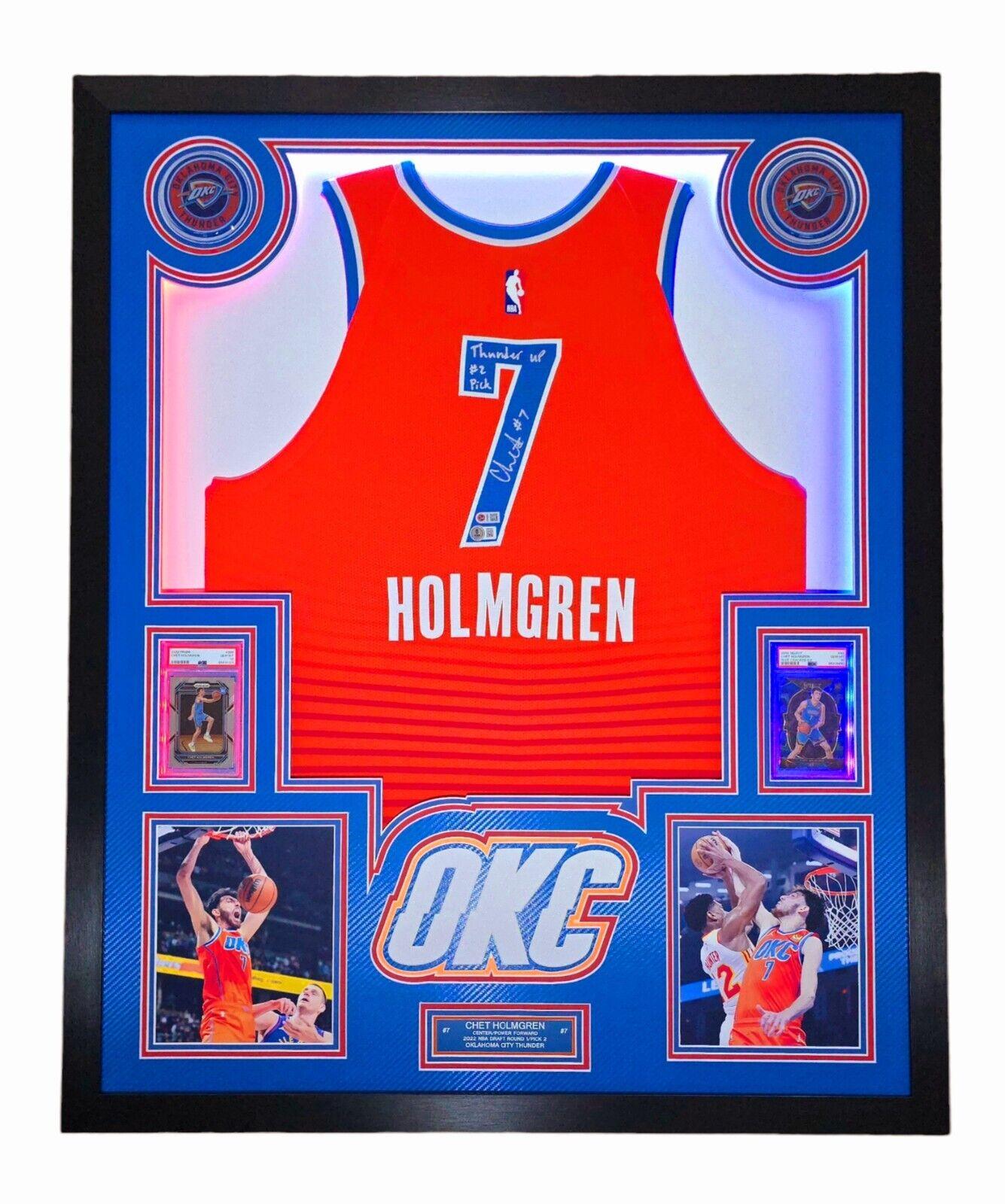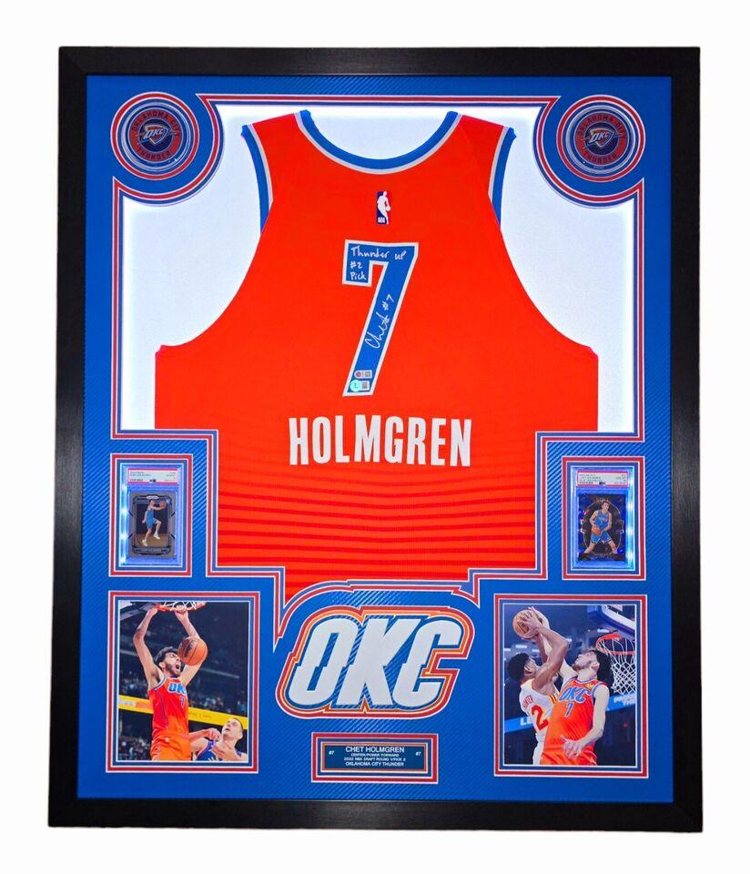 Chet Holmgren Signed LE Thunder Custom Framed LED Backlit Nike Jersey Display Inscribed "Thunder Up #2 Pick" & (2) PSA 10 Graded Rookie Cards (Beckett)
