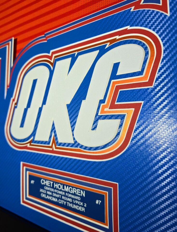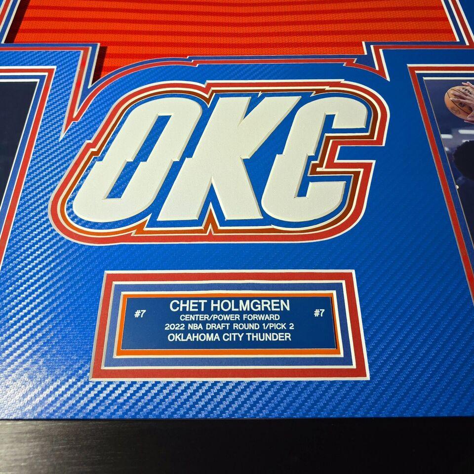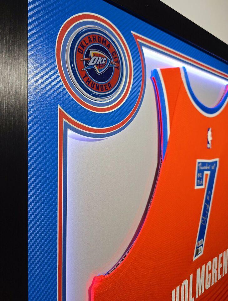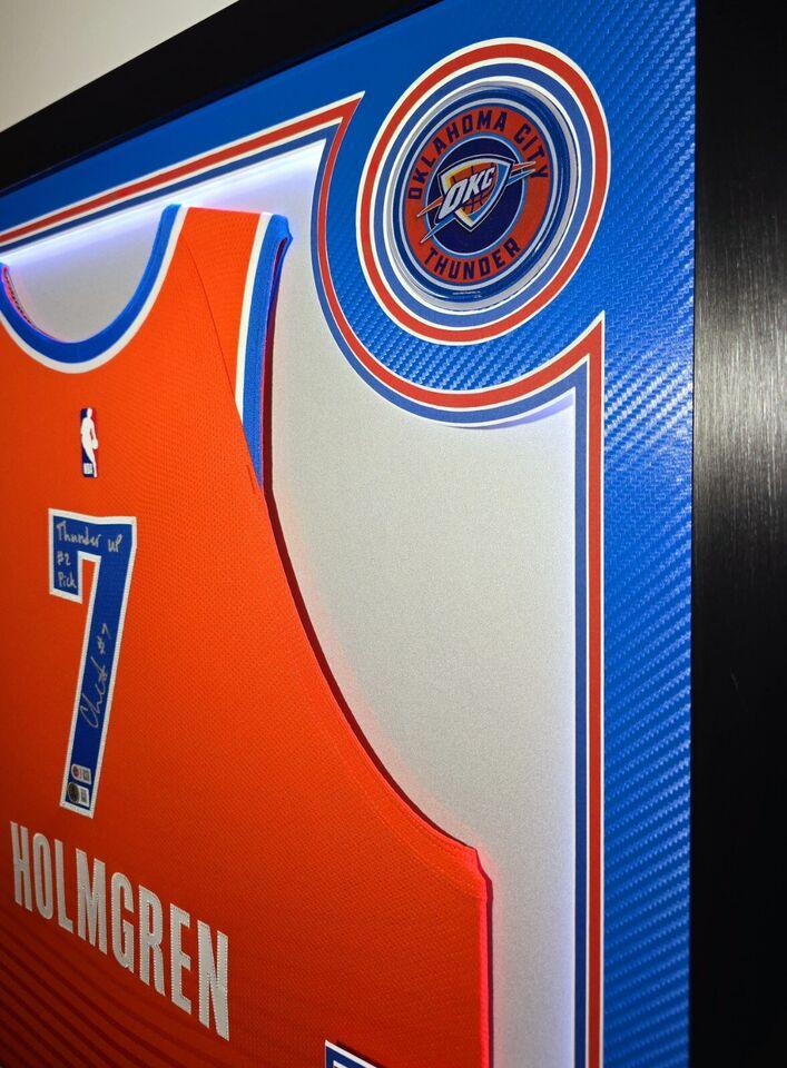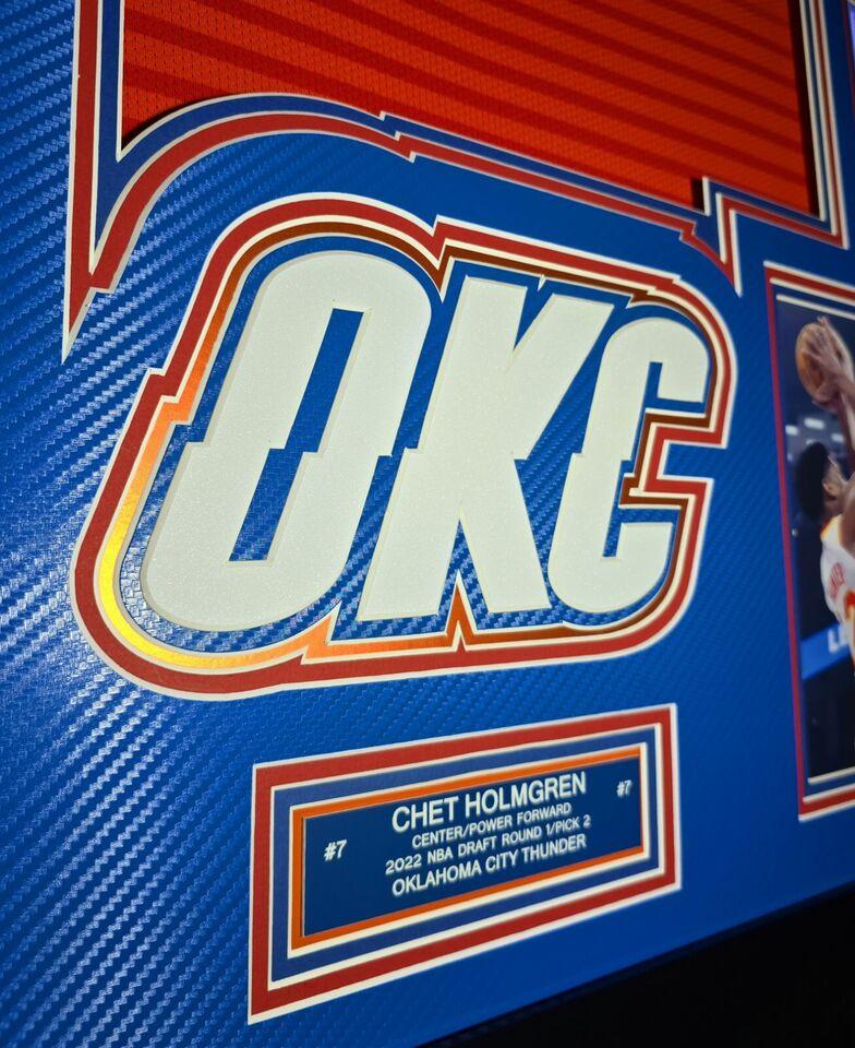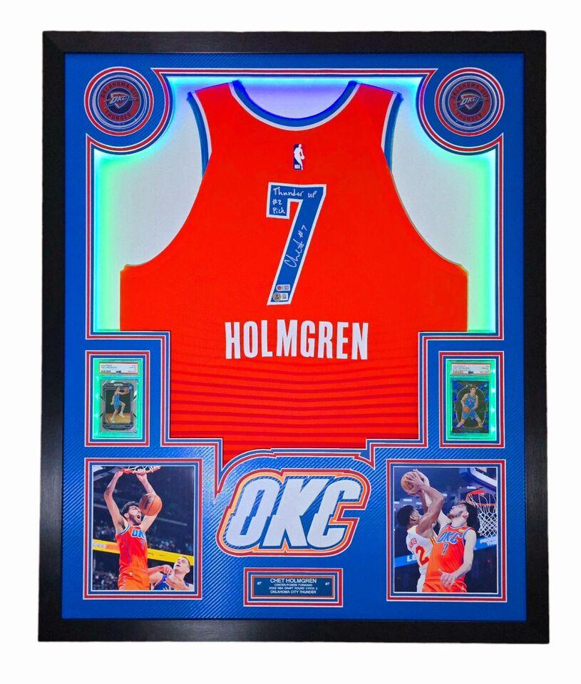 Custom frame measures 33" x 42" in size and comes installed with customizable LED backlighting. The frame features a Nike Swingman jersey that has been hand-signed by Chet Holmgren (Oklahoma City Thunder).