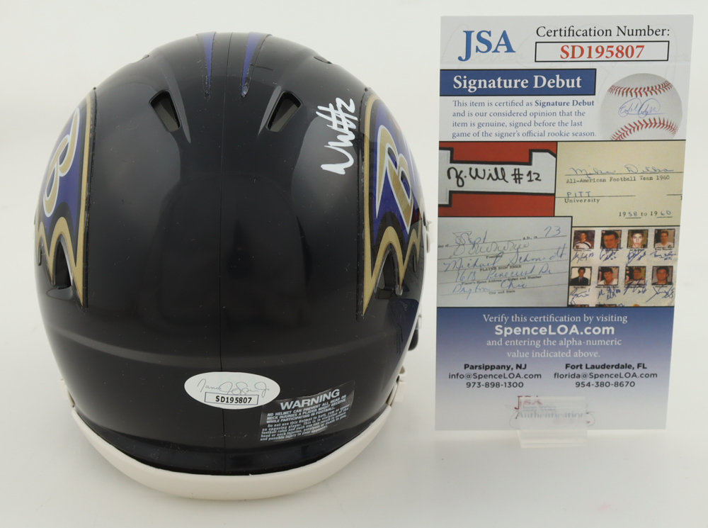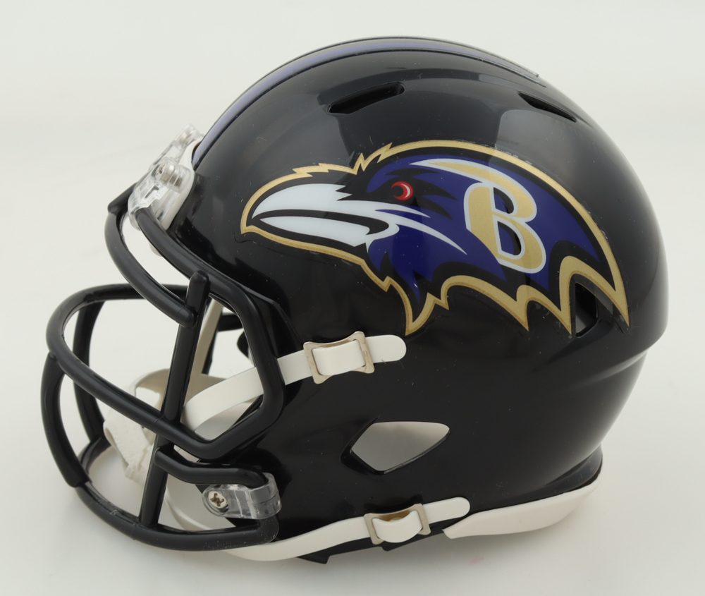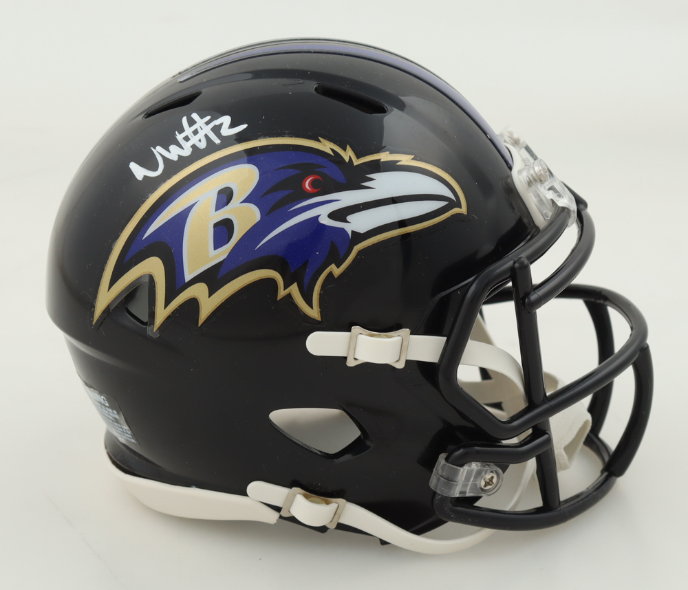 Riddell Baltimore Ravens Speed Mini Helmet. Hand-signed by Nate Wiggins.
