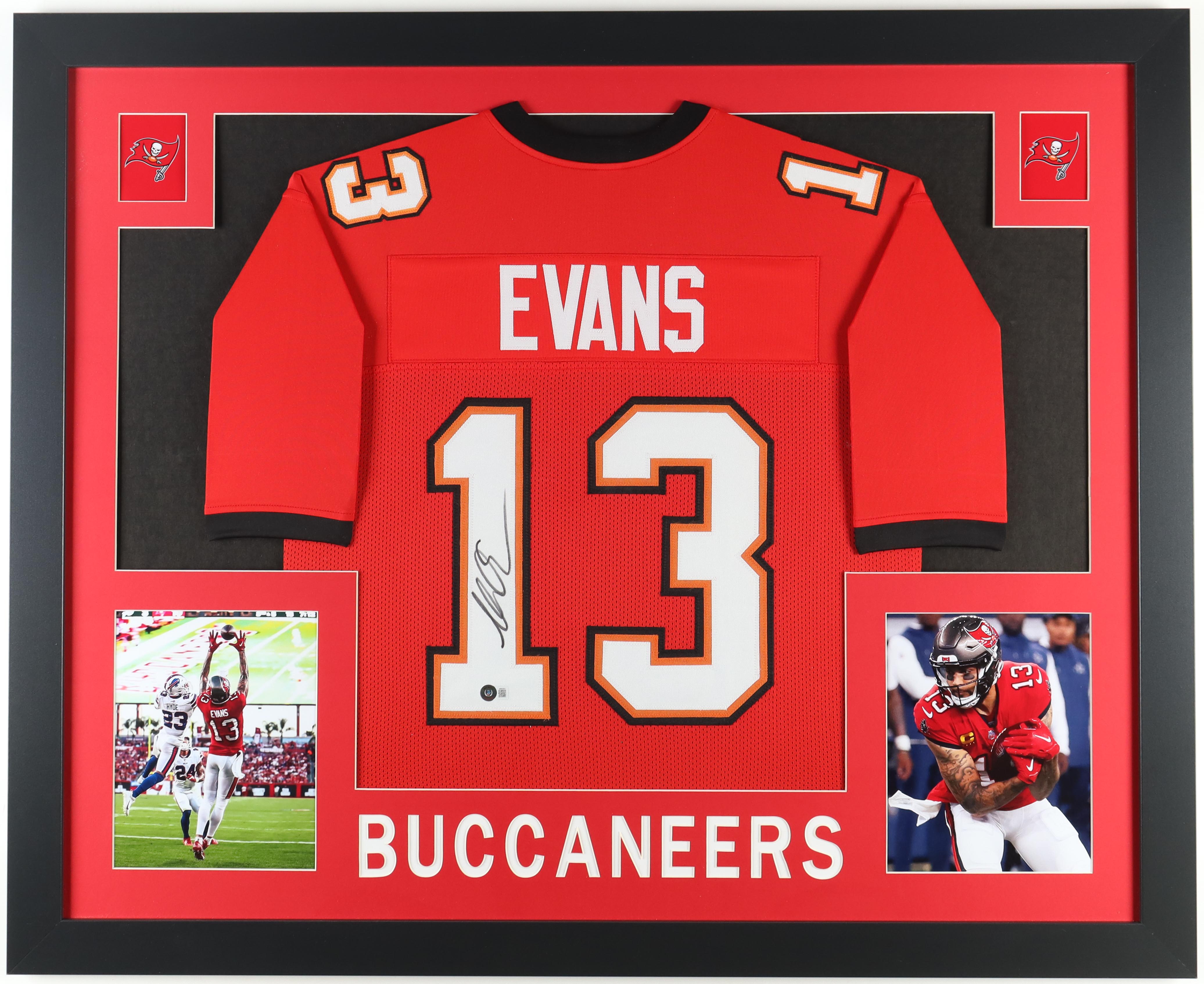 Custom frame measures approximately 35" x 43" in size and features a jersey that has been hand-signed by Mike Evans.