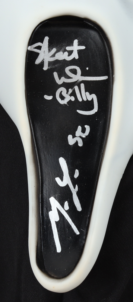 "Scream" Ghostface mask has been hand-signed and inscribed by Matthew Lillard (Stu Macher) and Skeet Ulrich (Billy). Please note, the Skeet Ulrich autograph is smudged.
