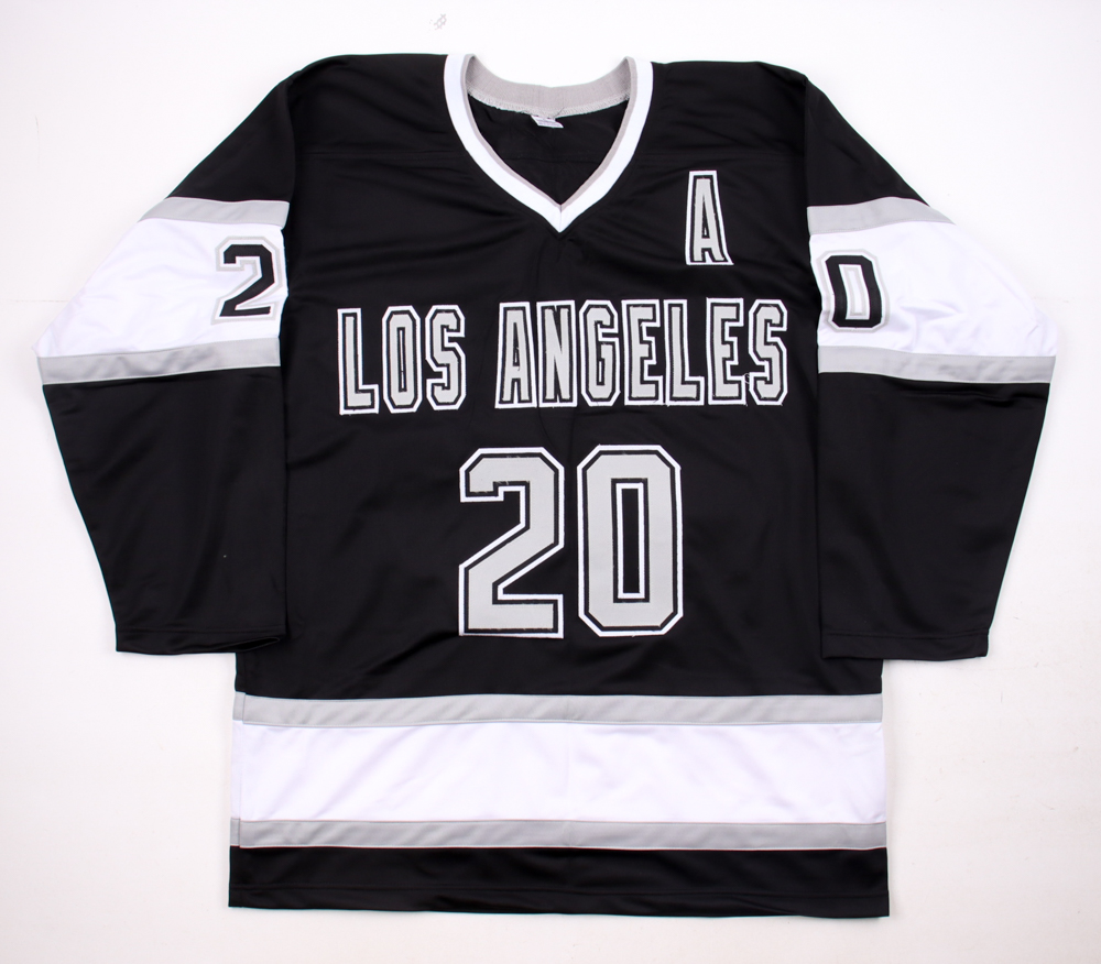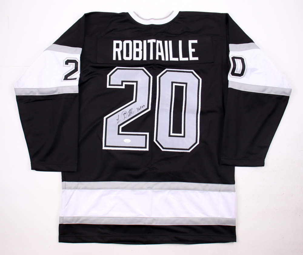 Custom jersey with everything sewn on, size XL. Hand-signed and inscribed by Luc Robitaille (HOF).