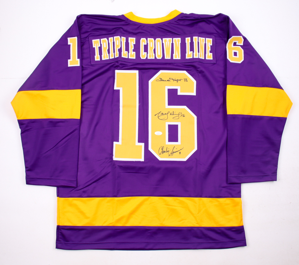 Custom jersey. Everything sewn on, size XL. Hand-signed by Charlie Simmer, Dave Taylor, and Marcel Dionne (HOF).